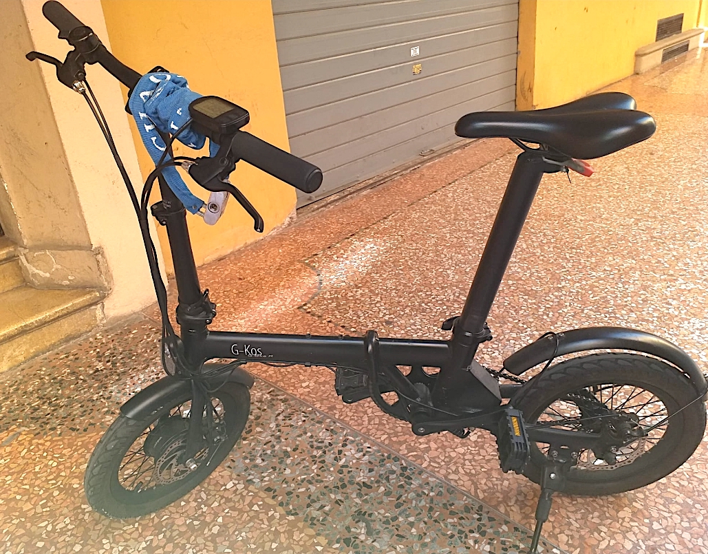Bici pieghevole elettrica, telaio nero, freni a disco, sellino rovinato, Il manubrio è stato cambiato da me medesimo con uno di colore argento, campanello rotto da un urto, parafanghi neri, cavalletto