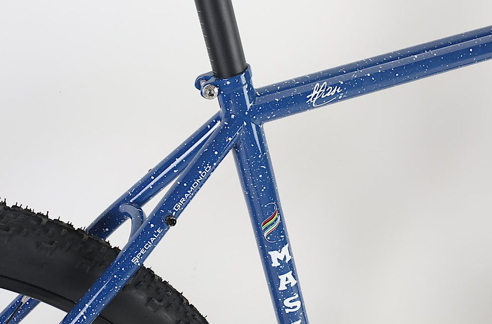 descrizione / segni particolari: Bici tipo trekking / gravel, telaio blu con le scritte MASI in bianco e forcella dritta, freni a disco, manubrio da corsa con comandi cambio alle estremi, copertoni grossi di marca WTB NANO 27.5, cerchi neri con le scritte BREV.M, sella in cuoio marrone, reggisella nero, portaborraccia nera montata sotto il tubo diagonale