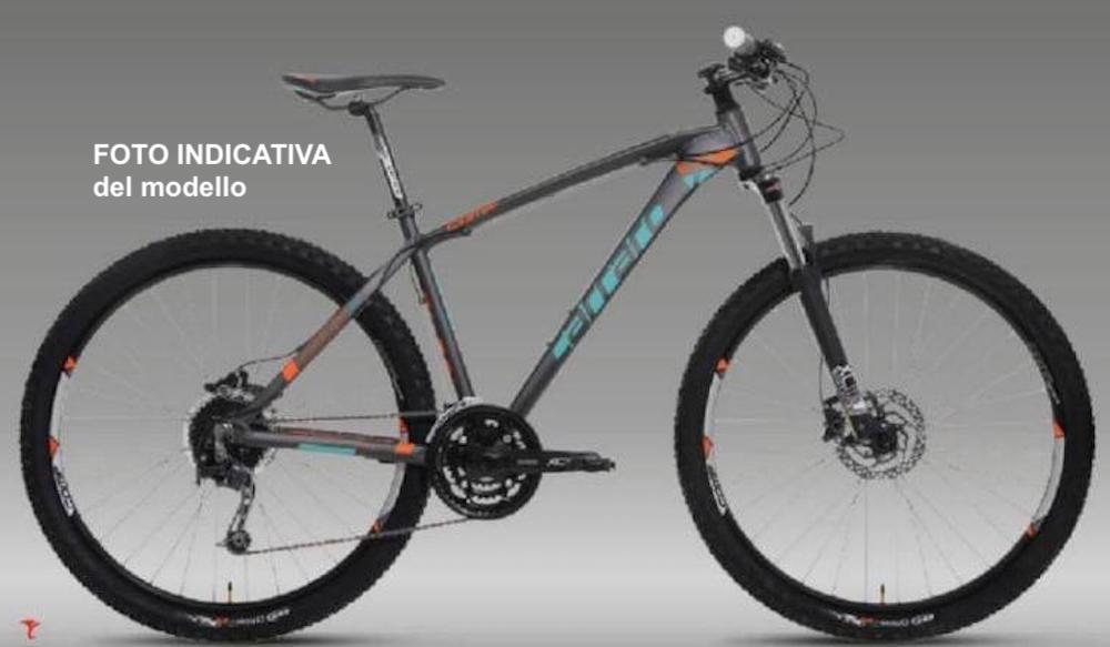 Mountain bike, telaio grigio con le CARRARO, ruote da 27,5", forcella anteriore ammortizzata, freni a disco, lucchetto fra sellino a telaio a combinazione numerica