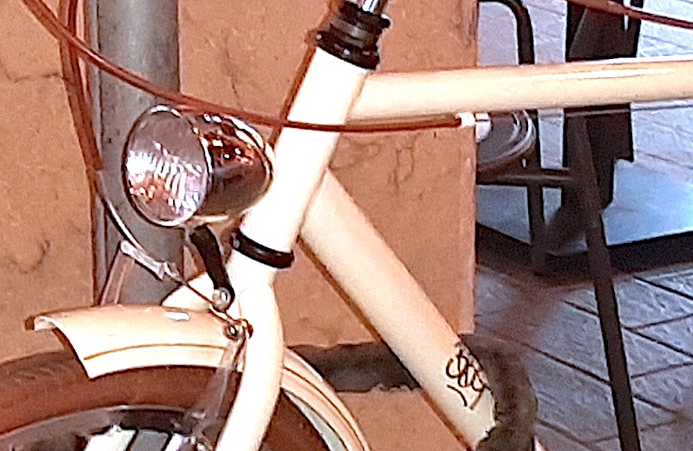 Bici da città, telaio beige con la scritta BBG sul tubo diagonale, carter catena e parafanghi beige, sellino e campanello marrone, portapacchi posteriore nero