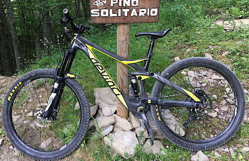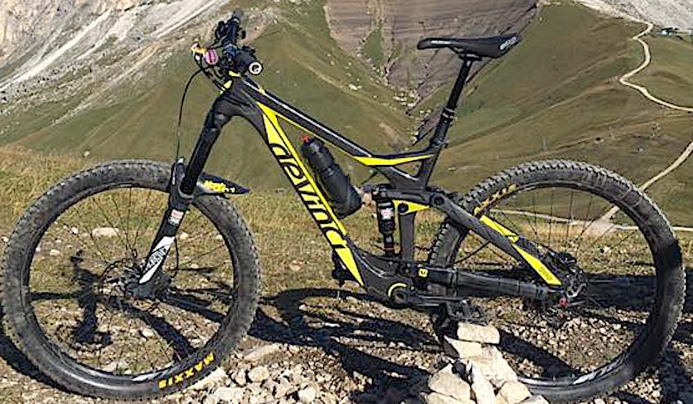 MTB all-mountain, telaio nero in carbonio, forcella ammortizzata Olinsh 160, ammortizzatore Rock Shox 140, componenti gruppo Gx 11x1, manubrio in carbonio Renthal