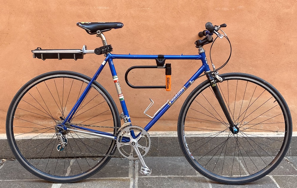 descrizione / segni particolari: Bici da corsa con manubrio dritto da mountain bike, telaio blu con la scritta BRIANZOLA so fondo argento, sella San Marco con scritte ricamate, forcella nera in carbonio marca Time, tubo reggisella Zoom, portapacchi posteriore