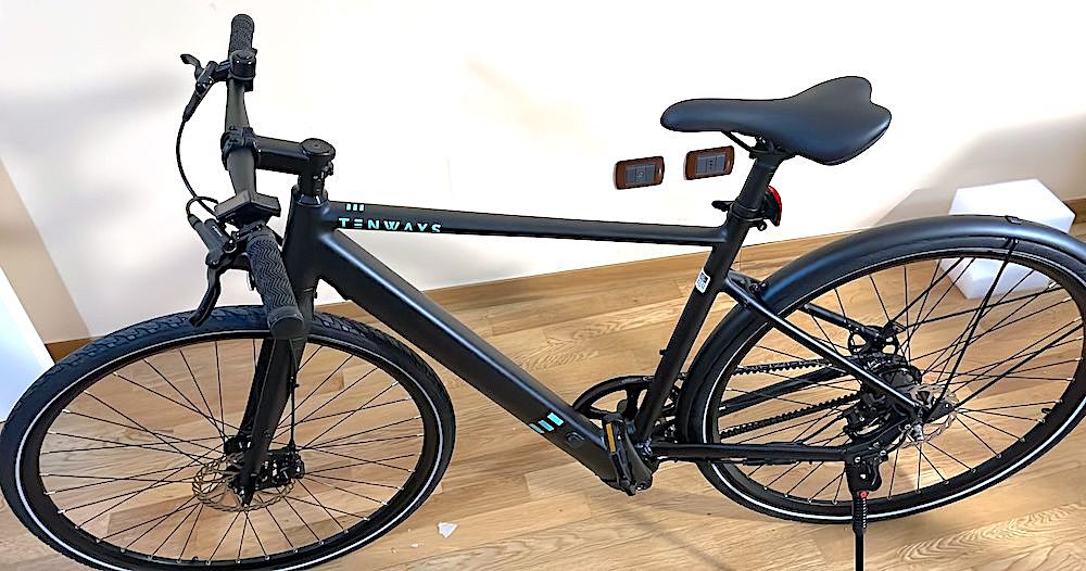 Bici elettrica da uomo, telaio nero con la scritta TENWAYS in verde, feni a disco, trasmissione a cinghia (anziché catena), cerchi neri, senza password la bici non dovrebbe funzionare