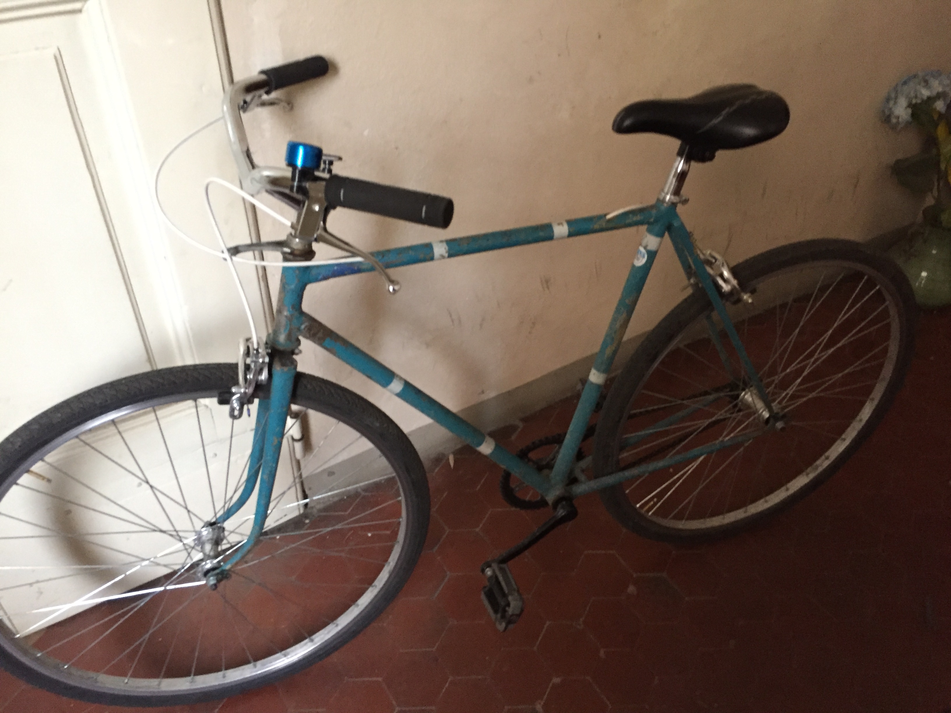 Vecchia city bike da uomo, telaio blue con delle bande bianche, senza carte o portapacchi, guaine dei cavi colore bianco
