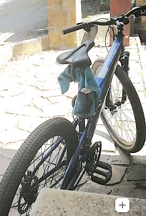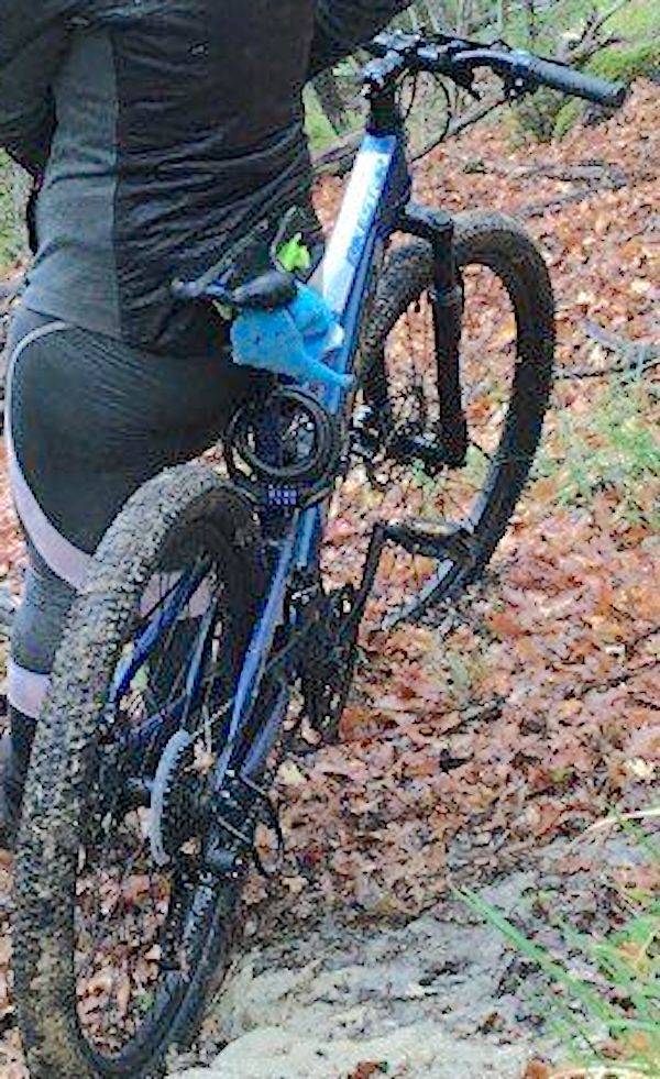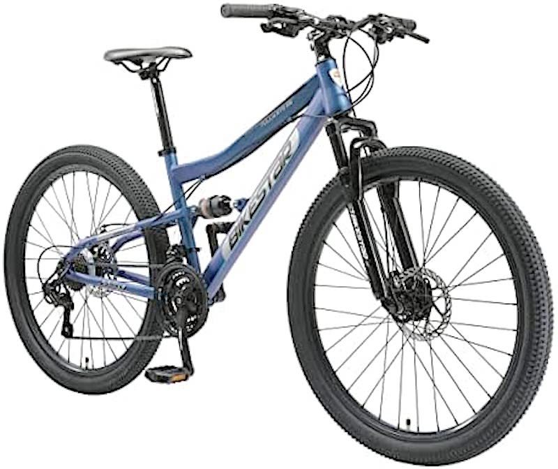 Mountain bike, telaio blu con la scritte BIKESTAR, taglia 15", doppio ammortizzata, freni a disco, portacellulare, portaborraccia, supporto per contachilometri.