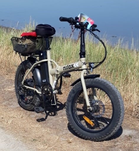 Bici pieghevole elettrica praticamente nuova, telaio colore beige con la scritta NILOX in nero, cestino nero su portapacchi posteriore, coprisella in silicone nero