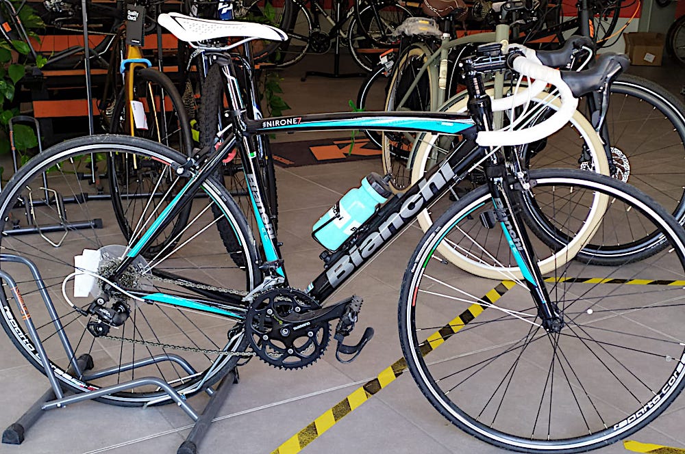 Bici Bianchi Via Nirone 7 Sora con telaio in alluminio ultraleggero nero con inserti azzurri e forcella in carbonio, fasce manubrio nere e sella bianca, cerchi in alluminio "reparto corse" e doppio porta borracce.