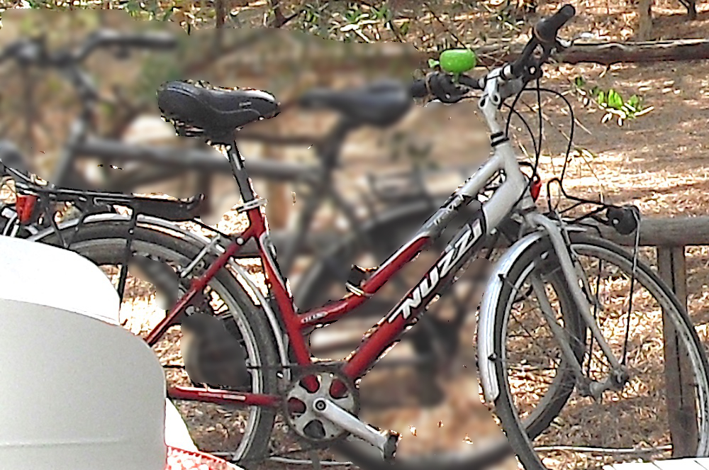 descrizione / segni particolari: City bike da donna con marce, telaio rosso metallizzato e argento con le scritte NUZZI e TRAVEL in bianco, manubrio nero con attacco grigio regolabile, senza carter / paracatena; sella marca B-Twin nera con coprisella in lattice grigio, parafanghi color alluminio, grosso campanello verde, ruote con sgancio rapido e cerchi alluminio, cambio posteriore Shimano a 6 velocità, priva di luce anteriore e priva di dinamo, luce posteriore sul portapacchi non funzionante, sul portapacchi posteriore una borsa laterale nera con due strisce catarifrangenti bianche, sul manubrio era agganciato un cestino in plastica nera del tipo rimovibile con manico |