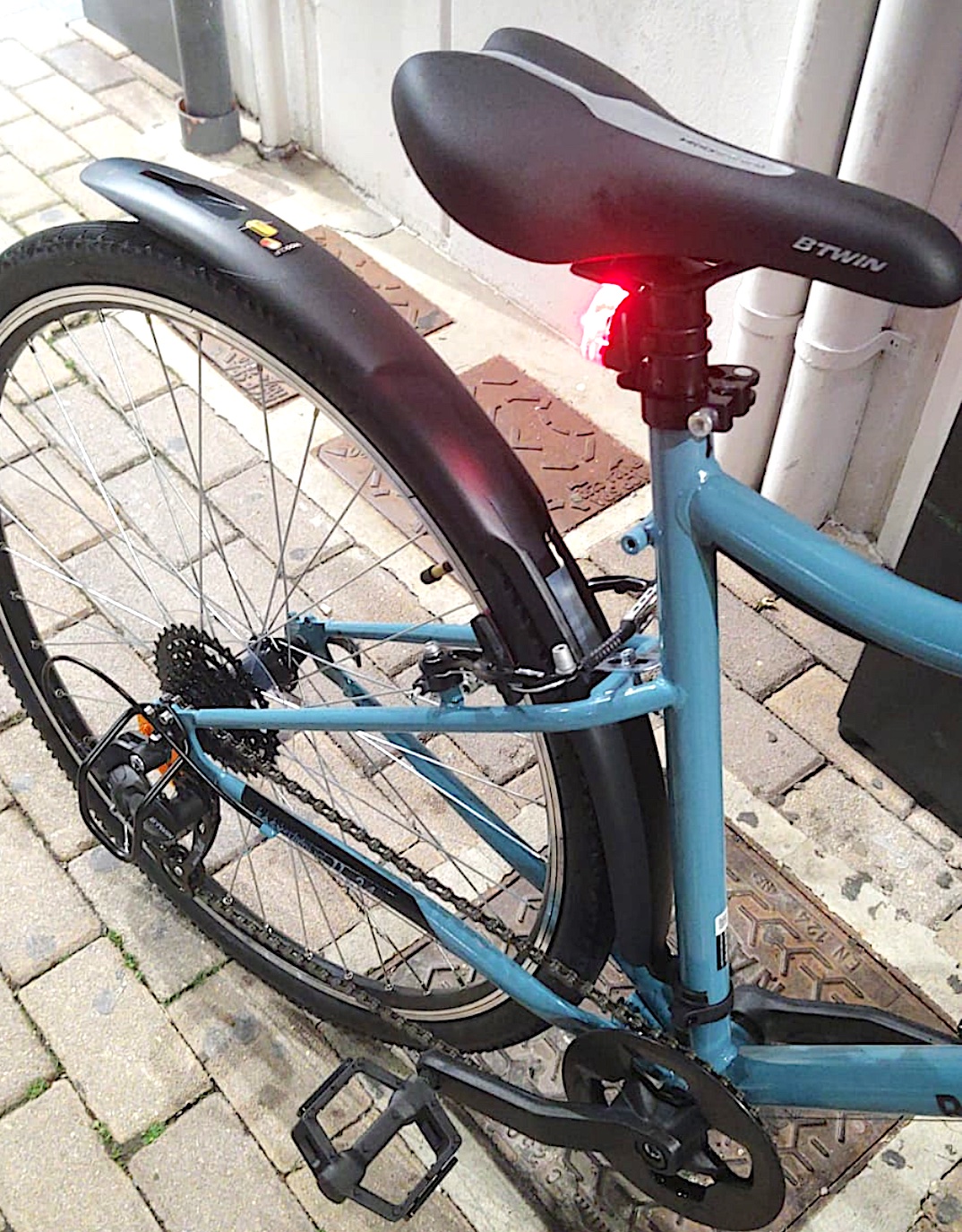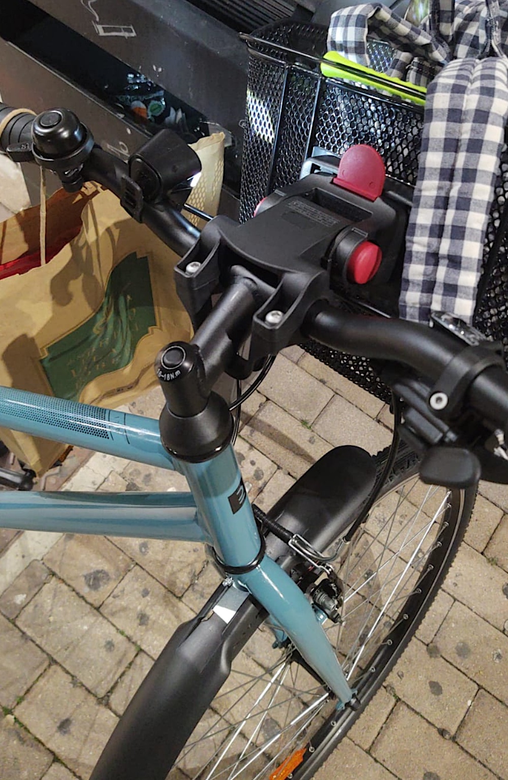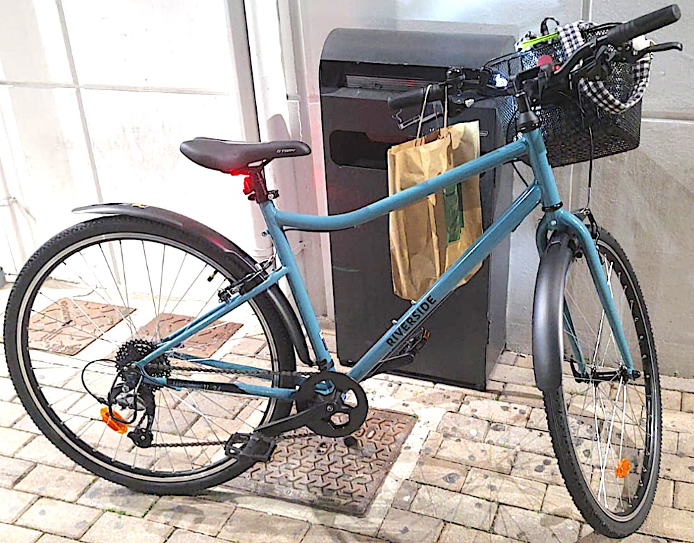 Bici da trekking nuova (2021), telaio colore blu / turchese con la scritta RIVERSIDE in nero, cestino e parafanghi neri, cavalletto