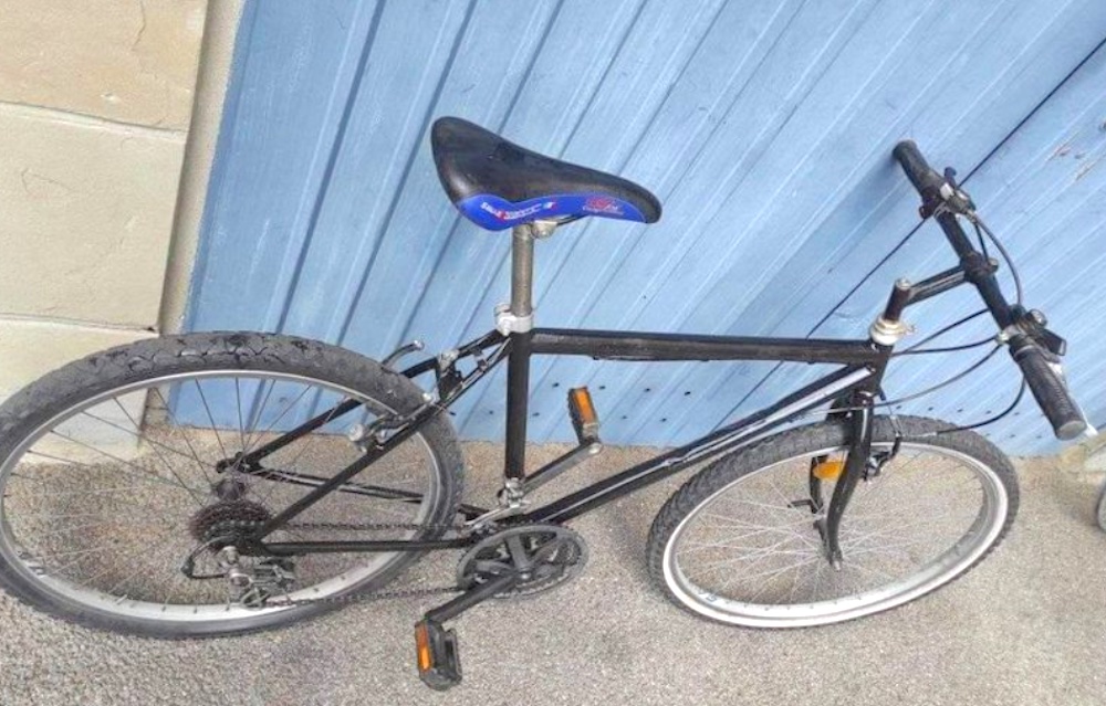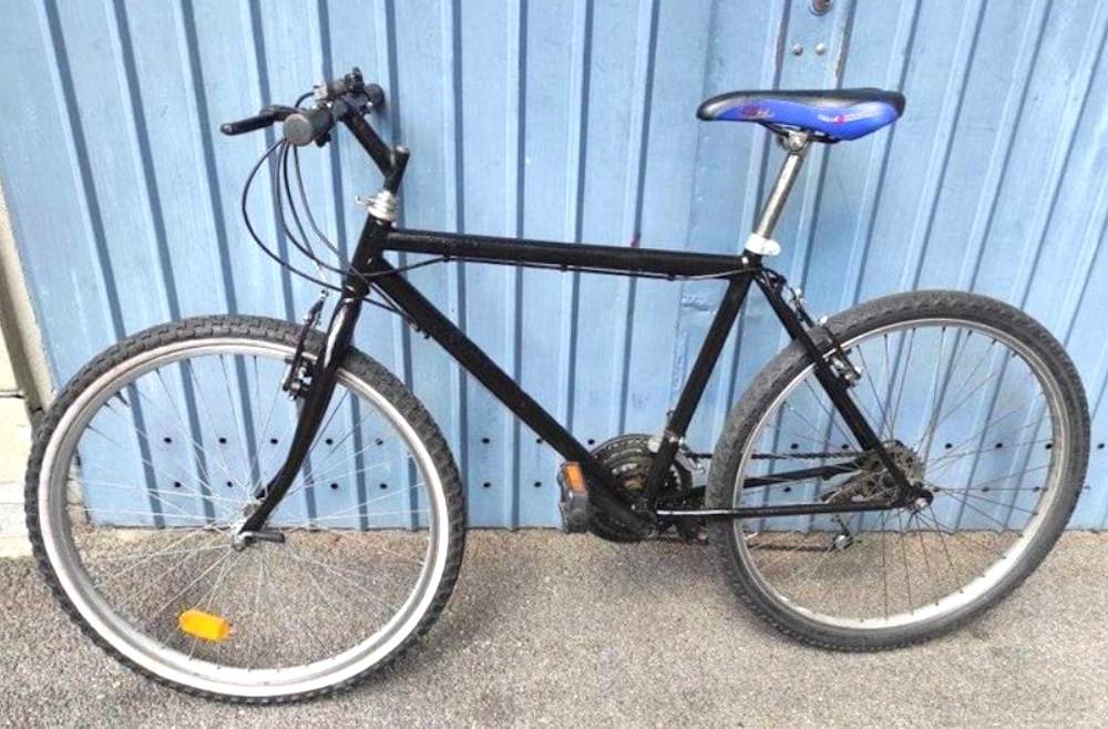 Vecchia city / mountain bike, telaio nero senza scritte di marca, alcune ammaccature sulla canna, sellino nero e blu, cambio marca Shimano SIS