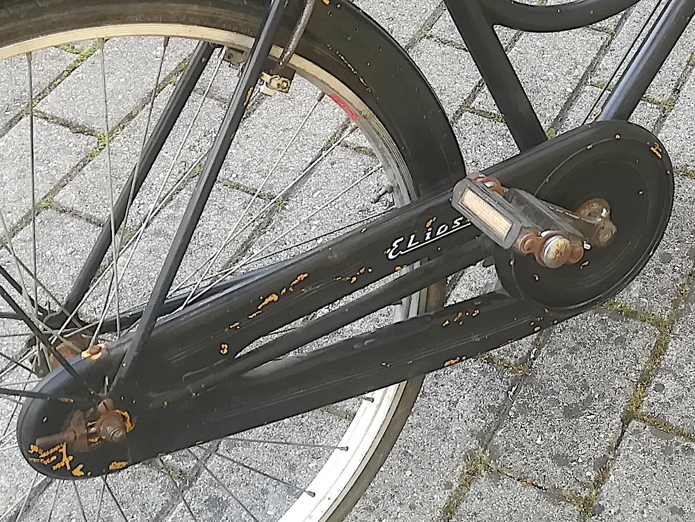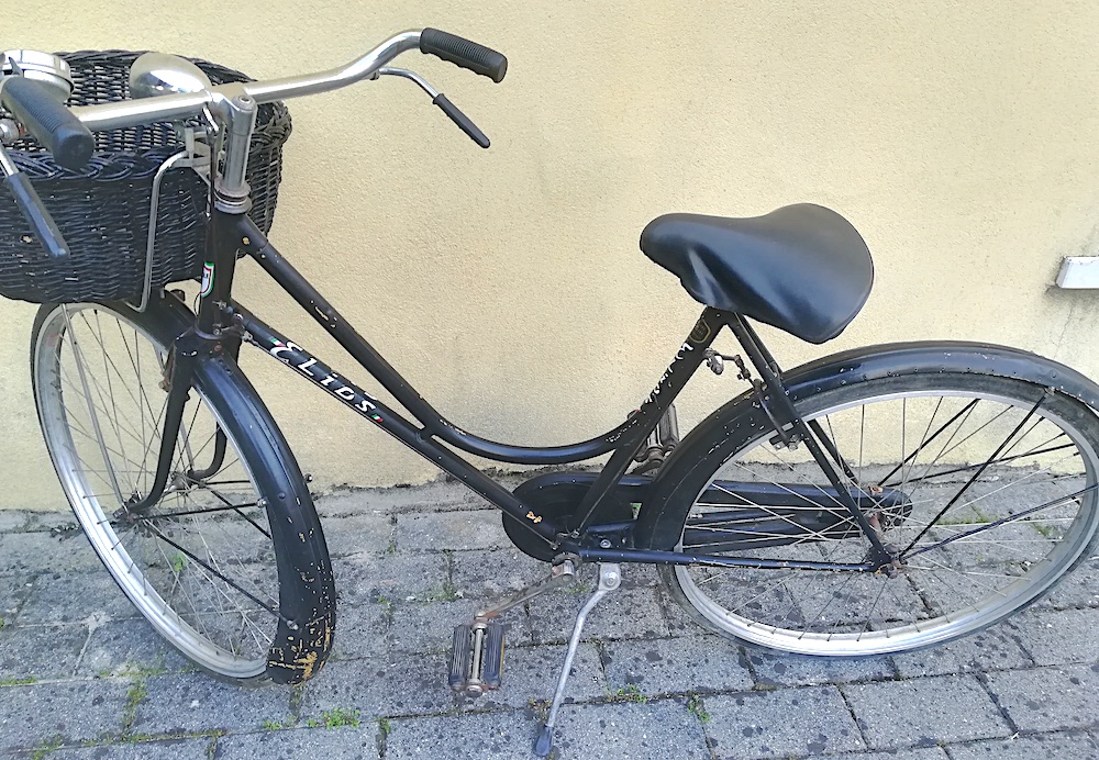 descrizione / segni particolari: Vintage city bike da donna, telaio nero con giallo sotto e con la scritta Elios in bianco e la bandiera dell'Italia, freni a bacchetta, fanale anteriore stile retró, portapacchi e cestino in vimini, carter catena chiuso con finestra, sellino a molle