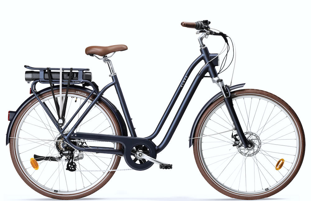 Bici elettrica, telaio blu scuro, forcella ammortizzata, freni a disco, cestino davanti nero marca Decathlon