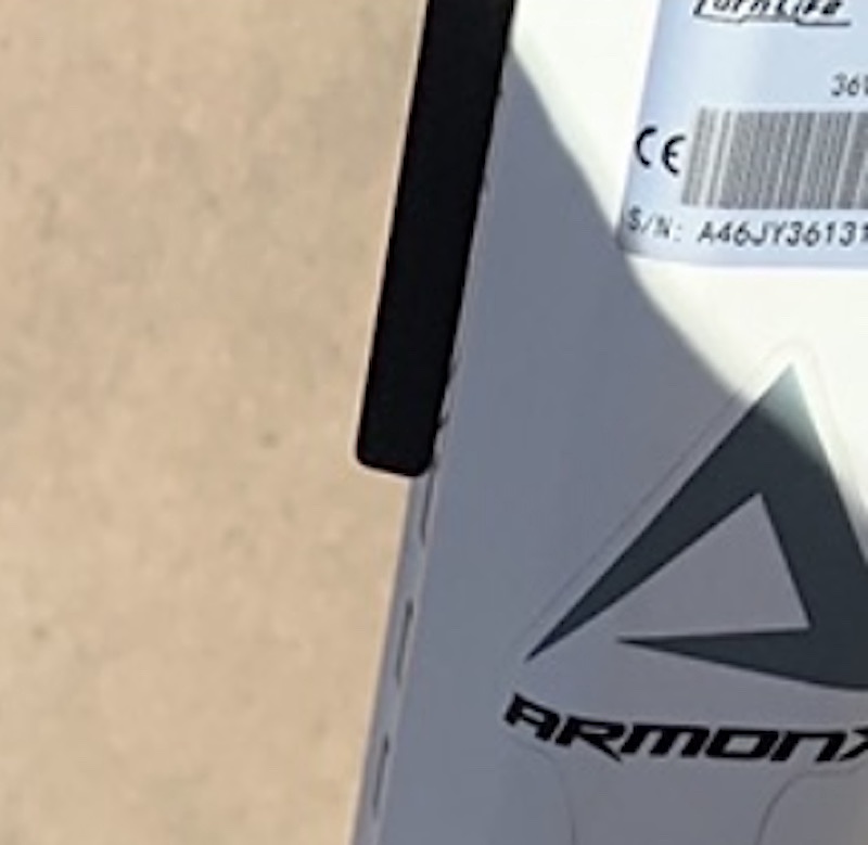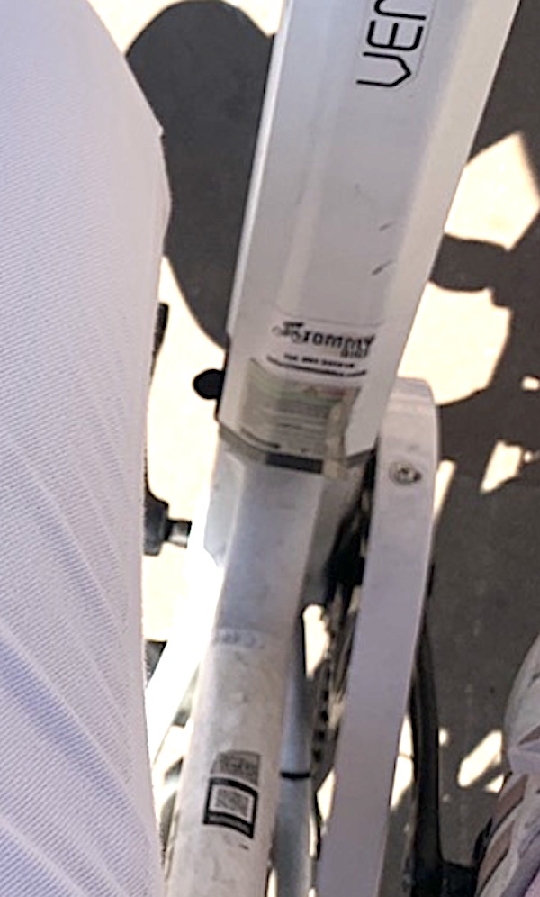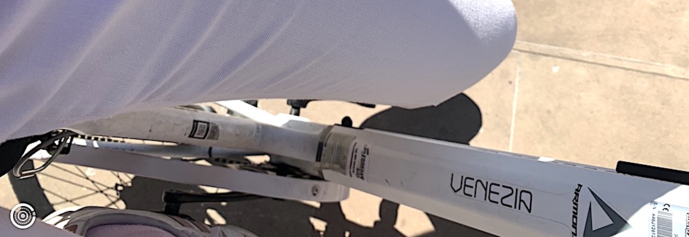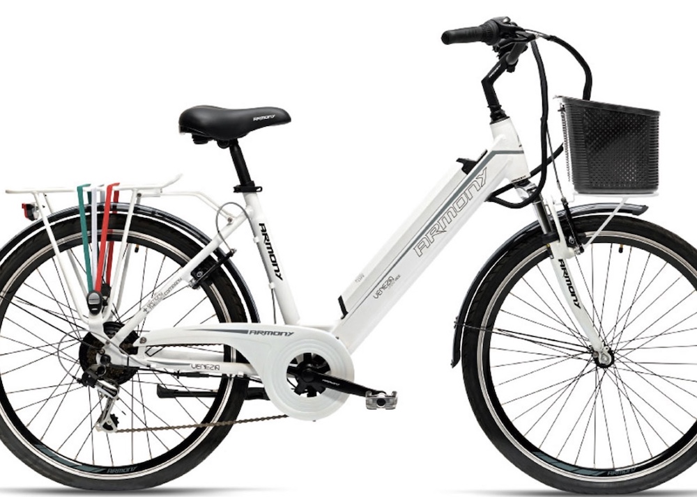 Bici elettrica, telaio bianco con le scritte ARMONY e VENEZIA in nero, forcella anteriore ammortizzata, cestino nero anteriore e seggiolino bimbi posteriore grigio ed arancione