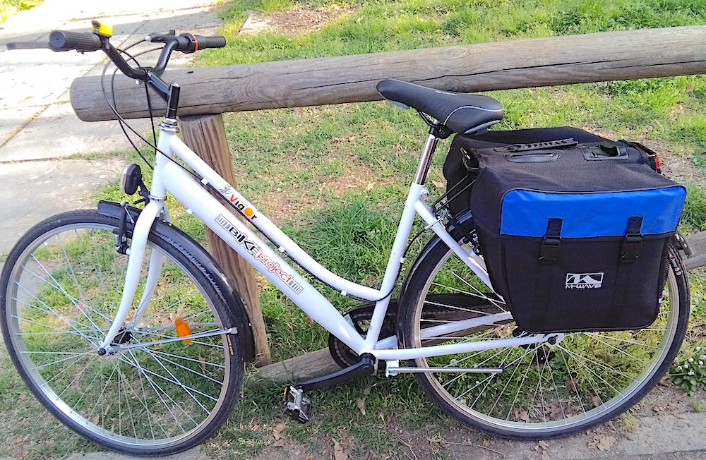 Bici da città, telaio bianco, ruote da 28", cambio, pedali dentati, cestino nero portaoggetti anterior, due seggiolino bimbo (uno anteriore e uno posteriore)