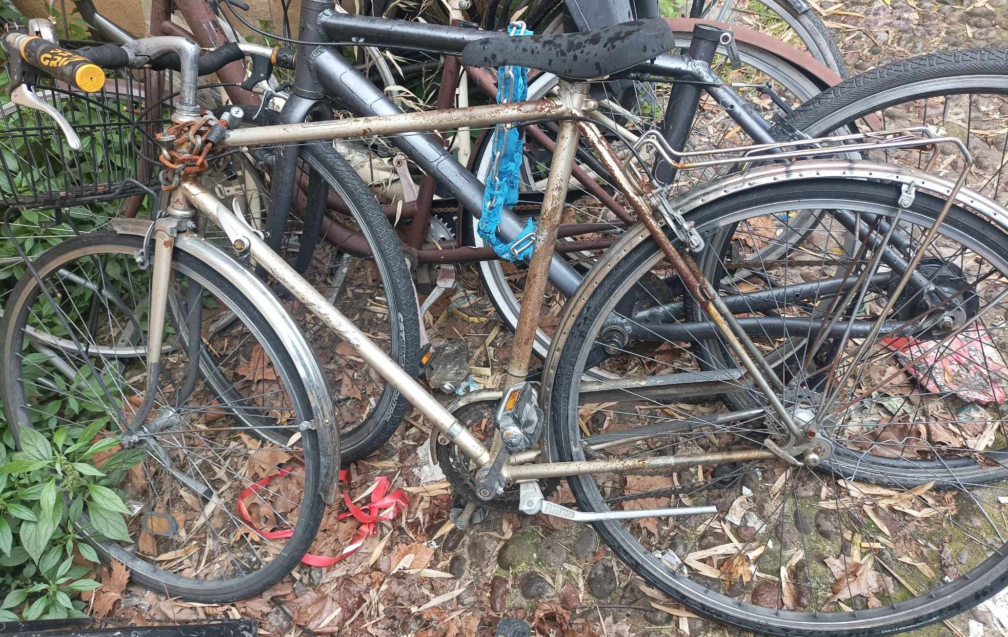 City bike, telaio argento, grande cestino nero rettangolare anteriore, entrambi i fanali staccabili, manubrio foderato come da corsa con nastro nero, codice punzonato sulla canna, due catene.