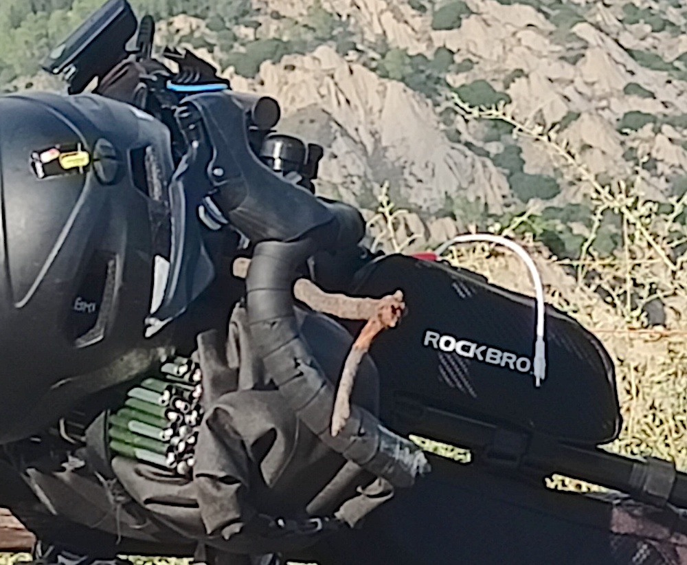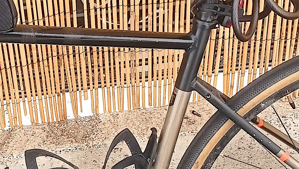 Bici stile gravel, telaio colore oro; Modifiche: attaccato manubrio Deda acciaio, sella Fizik, borsa telaio Agu, pedali Shimano SPD (gancio); Segni particolari: due sfregi su telaio tubo orizzontale, coperti con scotch isolante nero.