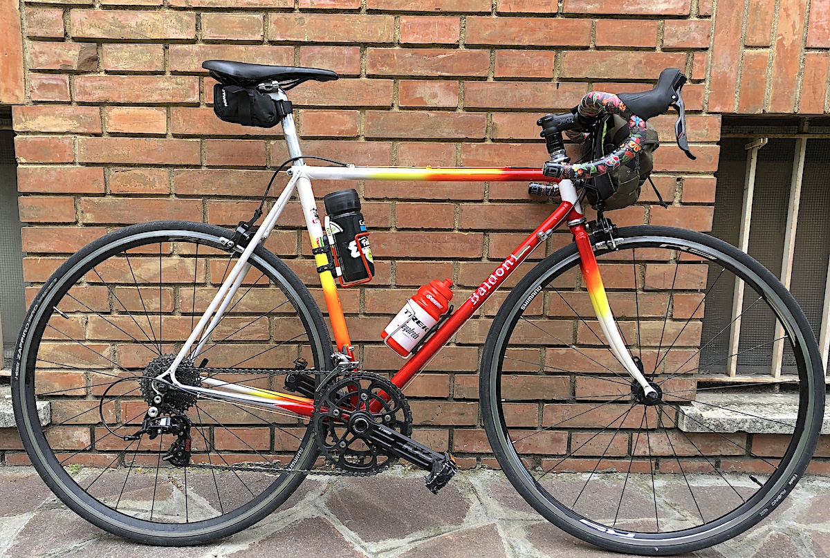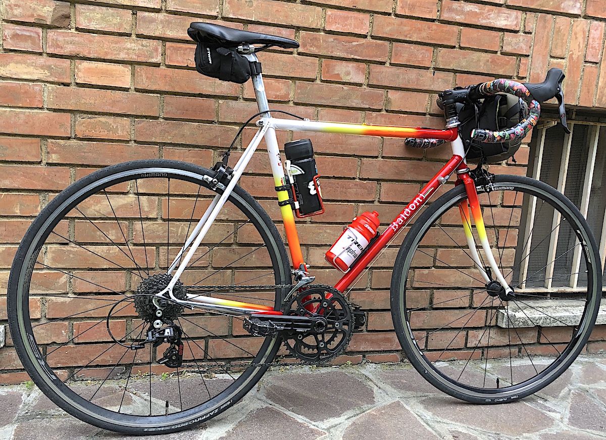 Bici da corsa con telaio Cinelli rosso bianco e giallo ma marcata e pantografato Baldoni, nastro manubrio a fiori, montava un gruppo Sensha Empire 12v e le ruote nere RS100 Shimano