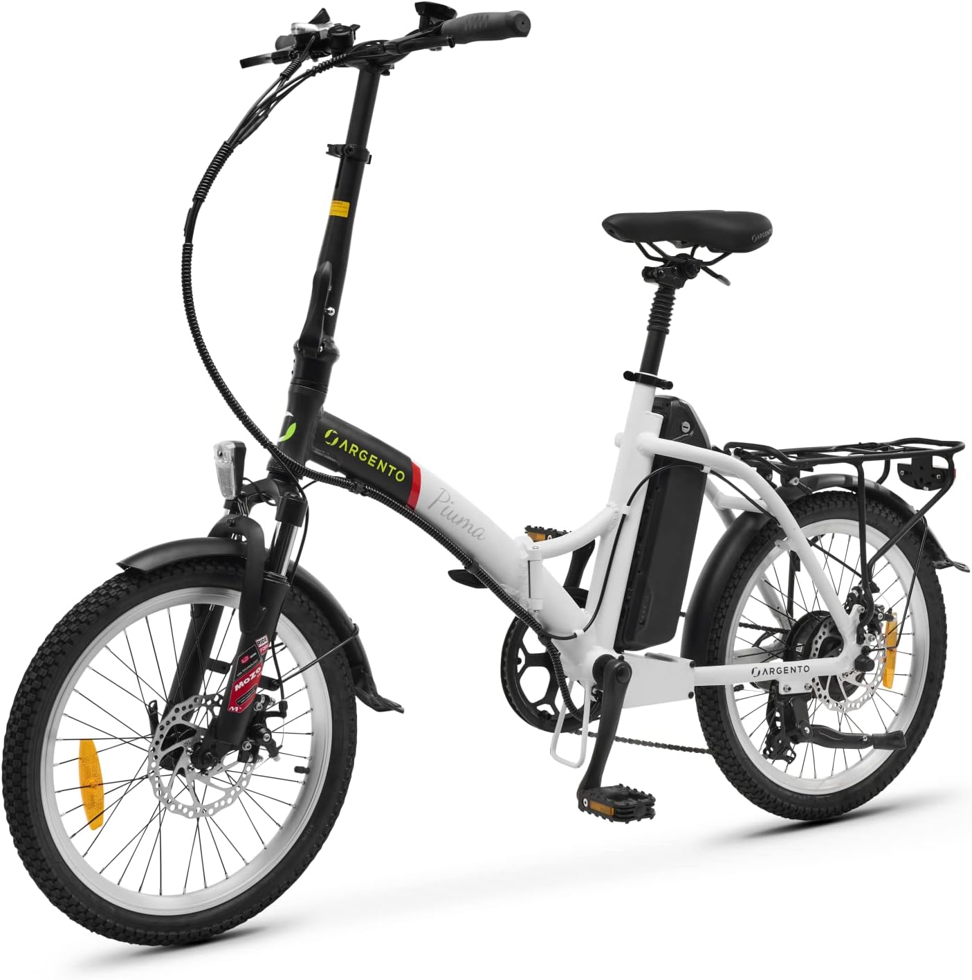 Bici pieghevole elettrica, telaio bianco e nero con el ascritta ARGENTO in giallo e PIUMA in grigia, forcella ammortizzata, freni a disco