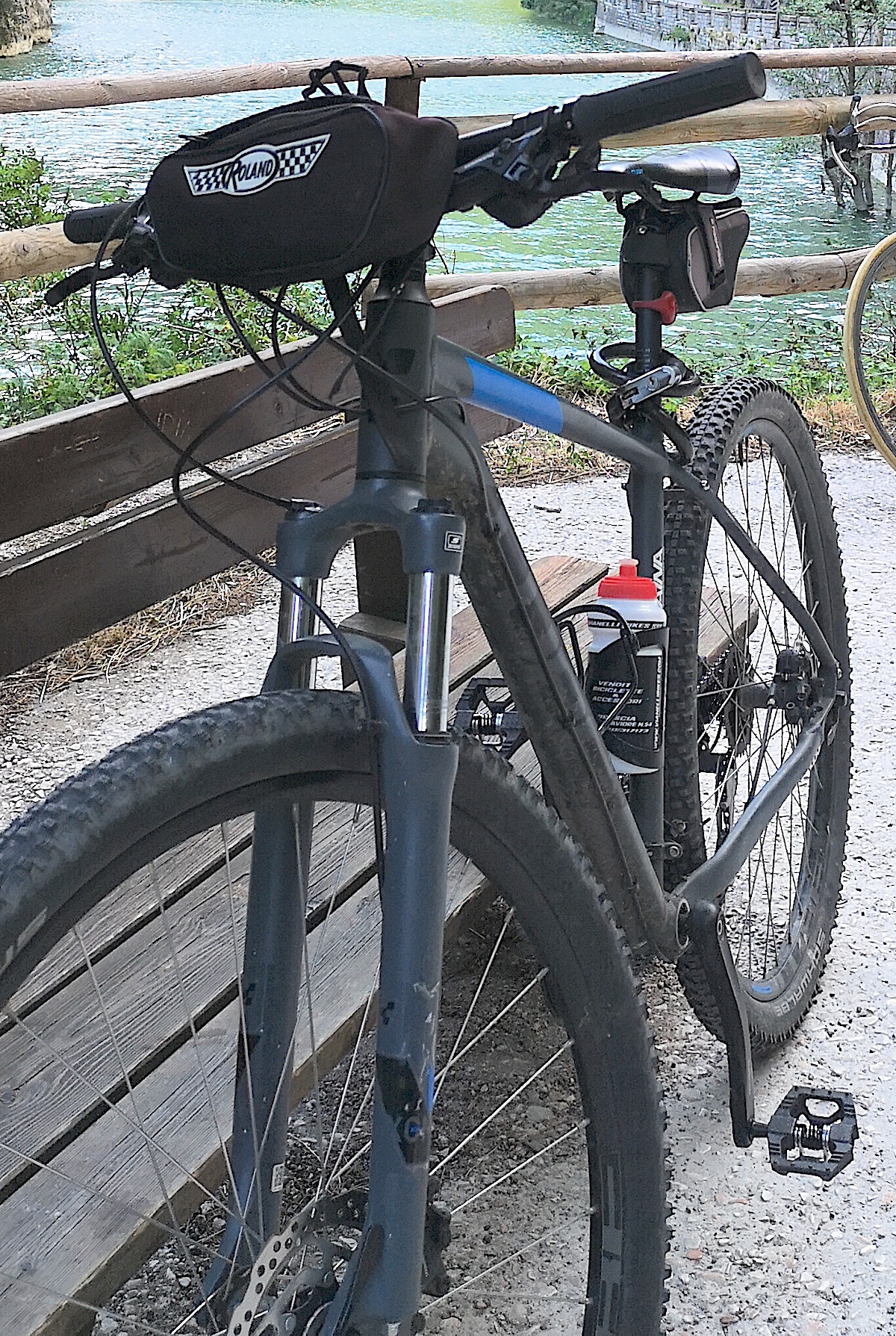 Mountain bike, telaio nero e blu con la scritta CUBE in grigio, forcella grigia ammortiuzzata, freni a disco, borsello atrezzi sul manubrio, borsello ricambi sotto il sellino, due porta borraccia uno rotto