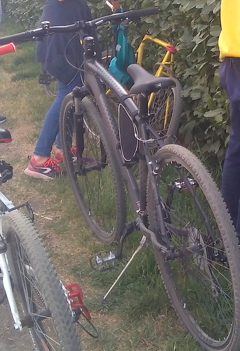 Mountain bike, telaio grigio scuro, forcella ammortizzata, freni a disco, borsa per catena attaccata con velcro, cavalletto