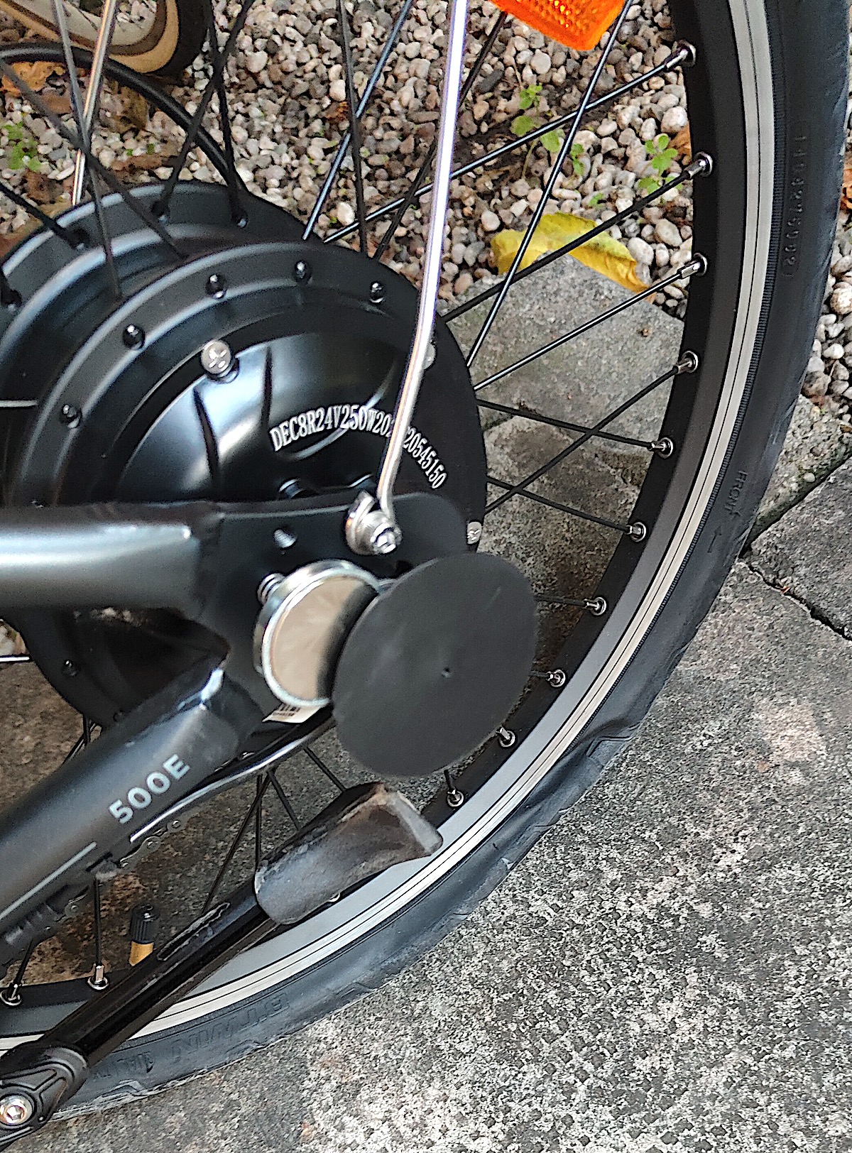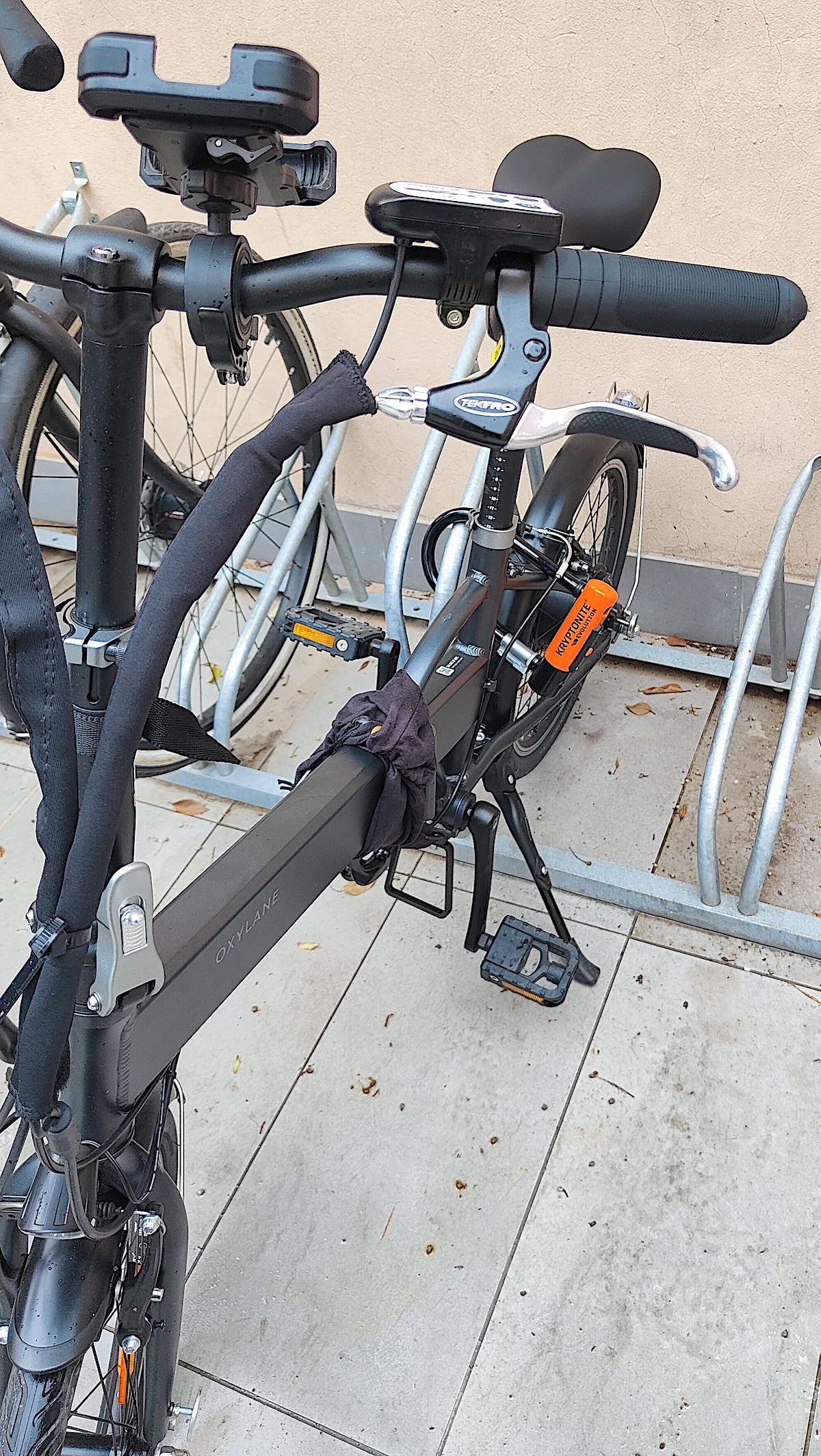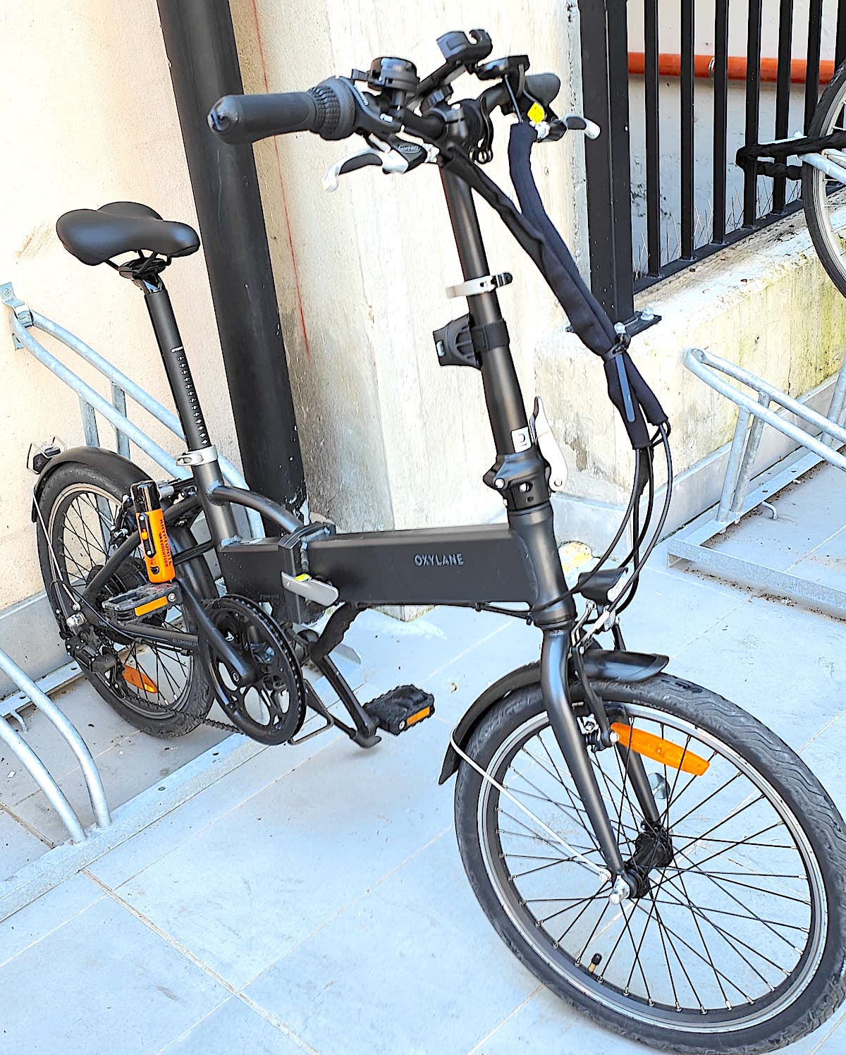 Bici pieghevole elettrica, telaio grigio scuro con la scritta OXYLANE in argento, lucchetto Kryptonite chiuso sul telaio