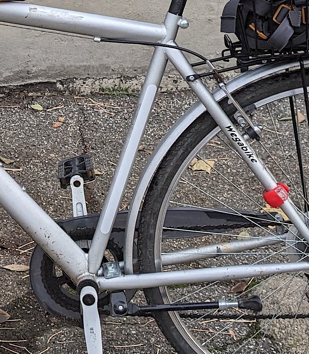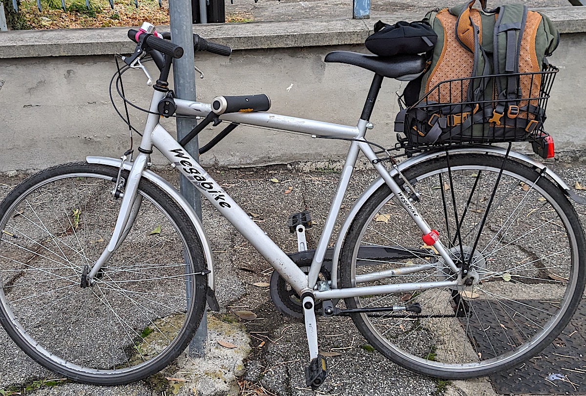 City bike da uomo, telaio argento con la scritta WEGABIKE in nero e vari graffi, adesivi catarifrangenti, porta catena, cestino nero su portapacchi posteriore, parafanghi argento