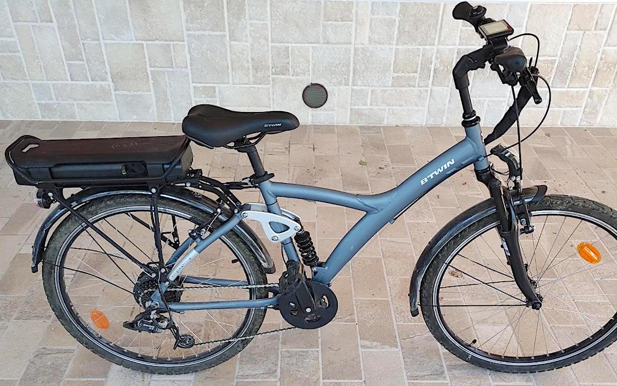 Bici elettrica, telaio blu metallizzato con la scritta B-TWIN in bianco, forcella nera ammortizzata, cavalletto rotto