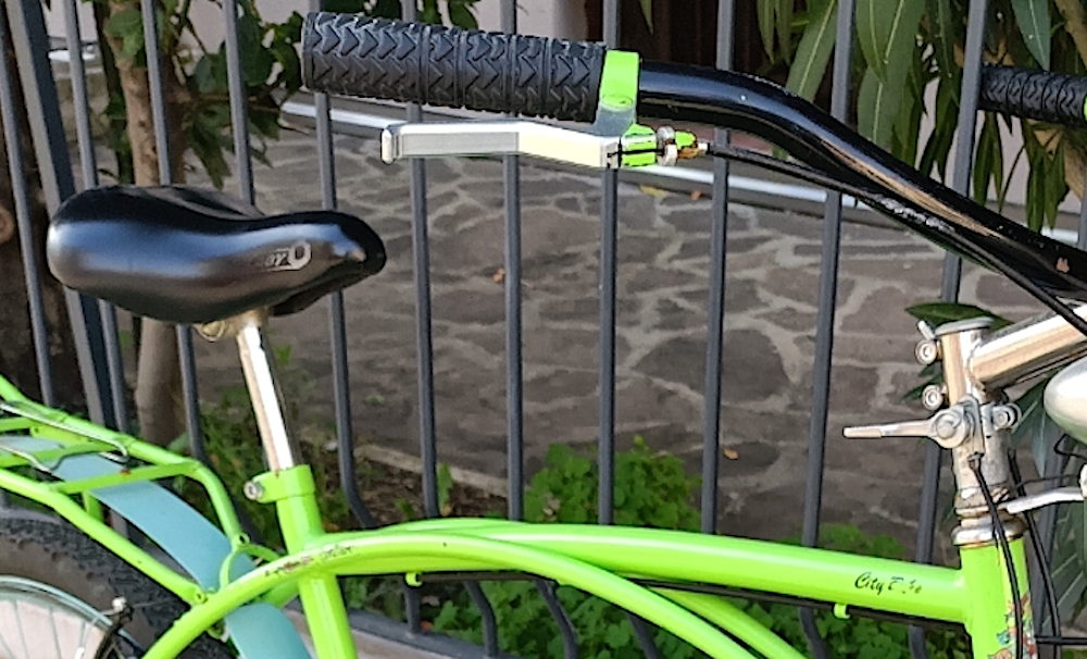 descrizione / segni particolari: Bici stile cruiser, telaio verde acceso con la scritta BERKEL colore oro, forcella cromata, parafanghi sottili blu, cerchi e raggi blu, cambio con le leve di commando sull'attacco manubrio, portapacchi posteriore, fanali a dinamo