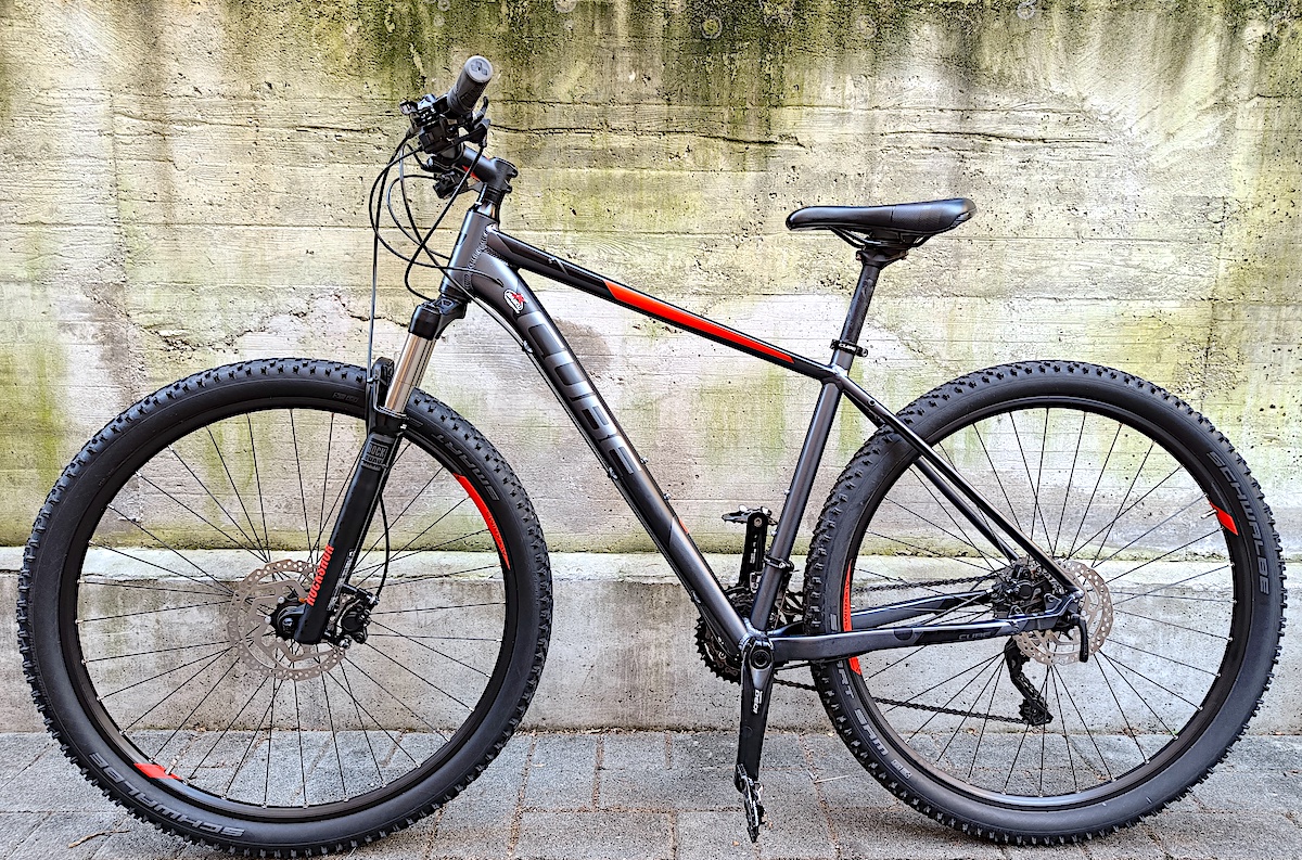 Mountain bike, telaio grigio scuro con la scritta CUBE in argento, forcella ammortizzata marca RockShox, freni a disco, adesivo Armaroli, pedali non originali