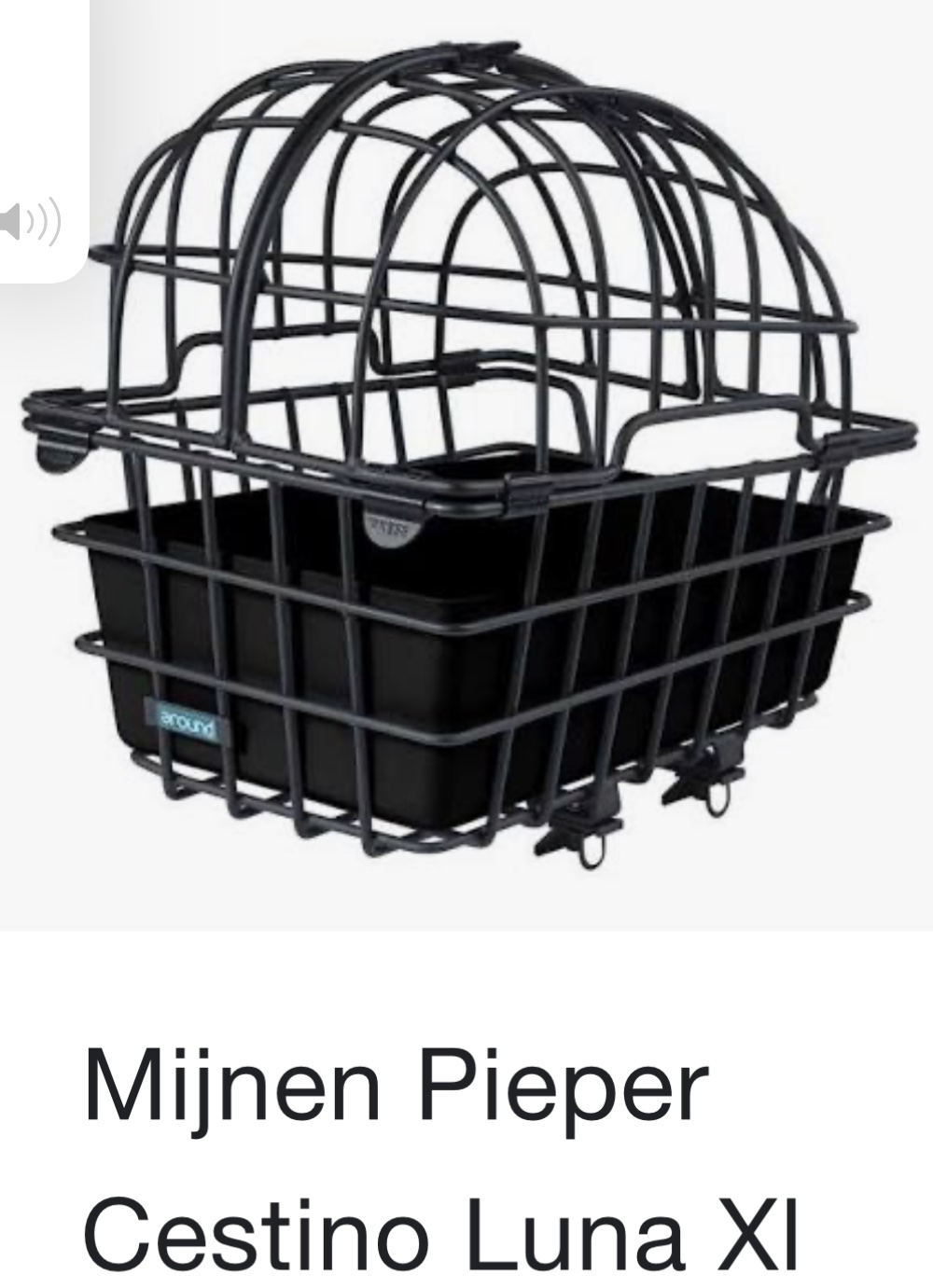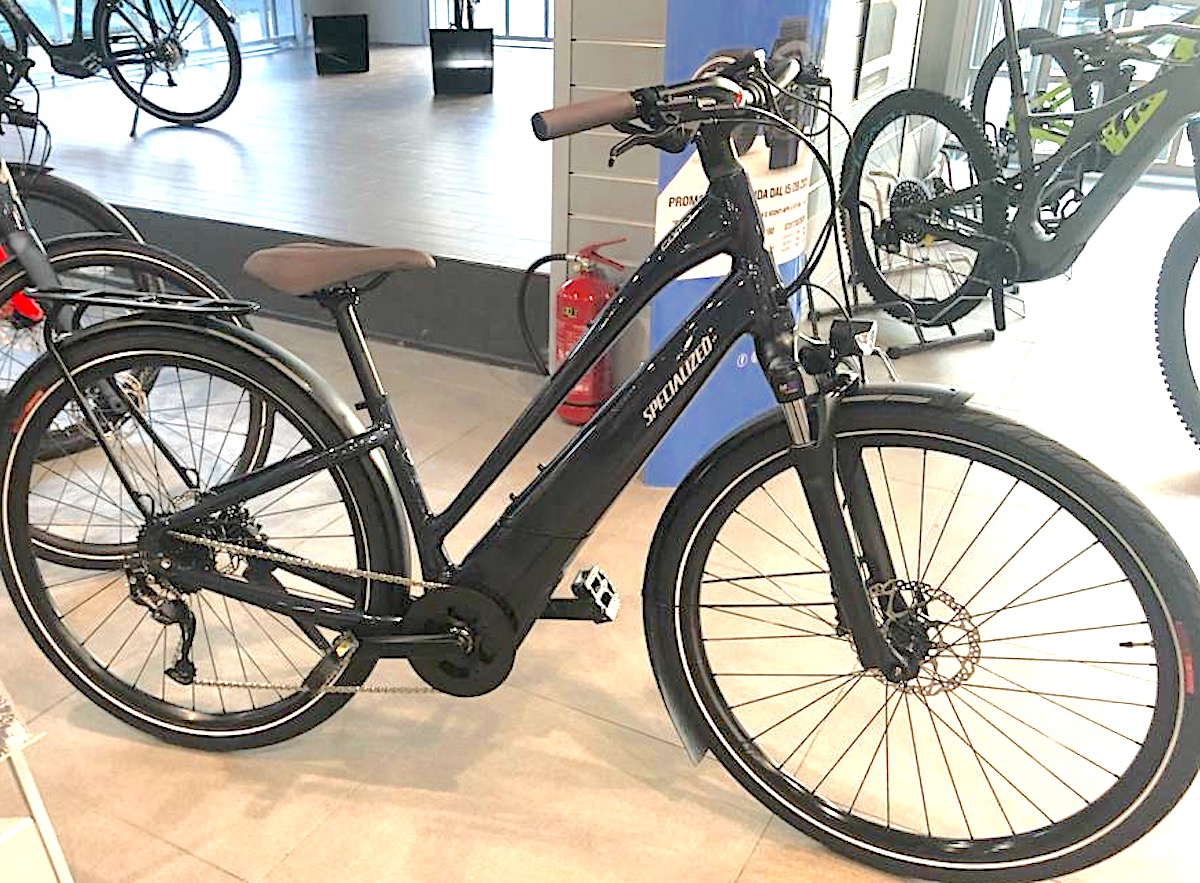 Bici elettrica, telaio blu scuro con la scritta SPECIALIZED in bianco, forcella ammortizzata, freni a disco, cestino posteriore per cane (foto), sellino e manopole colore marrone