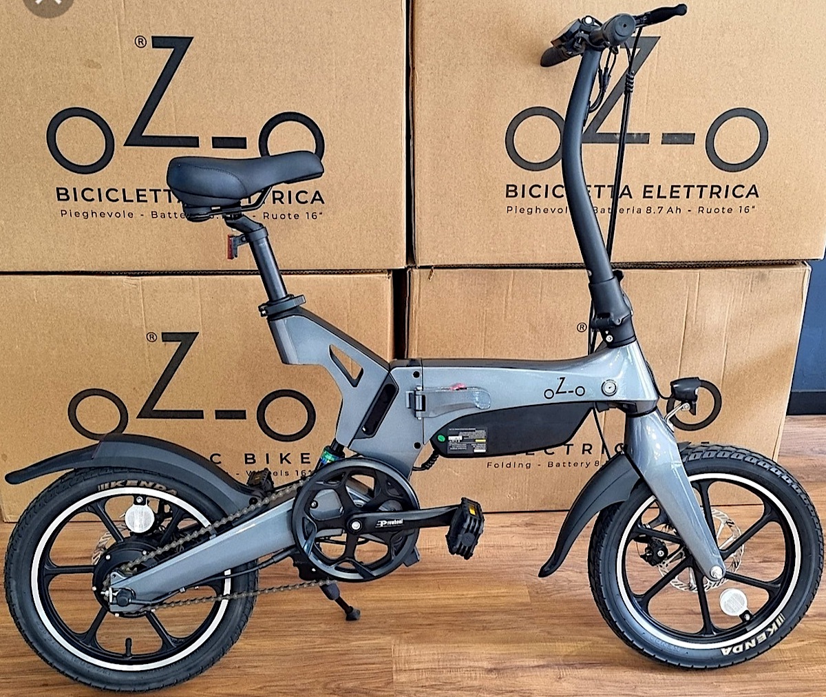 Bici pieghevole elettrica, telaio grigio con las scritta OZ-O in nero, con ruote piccole, freni a disco, parafanghi neri