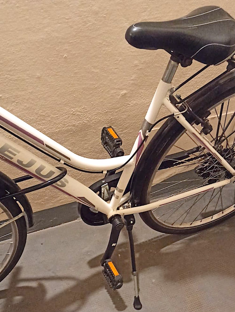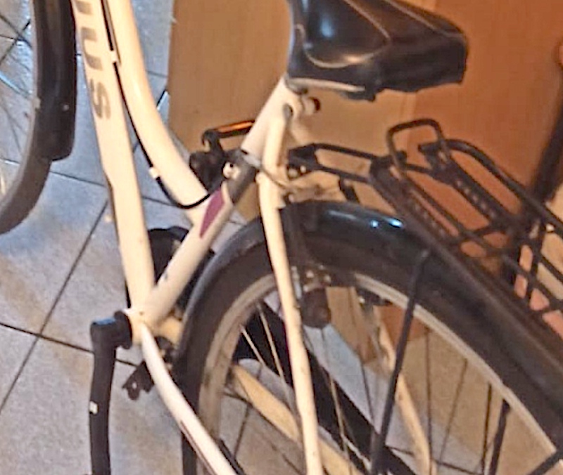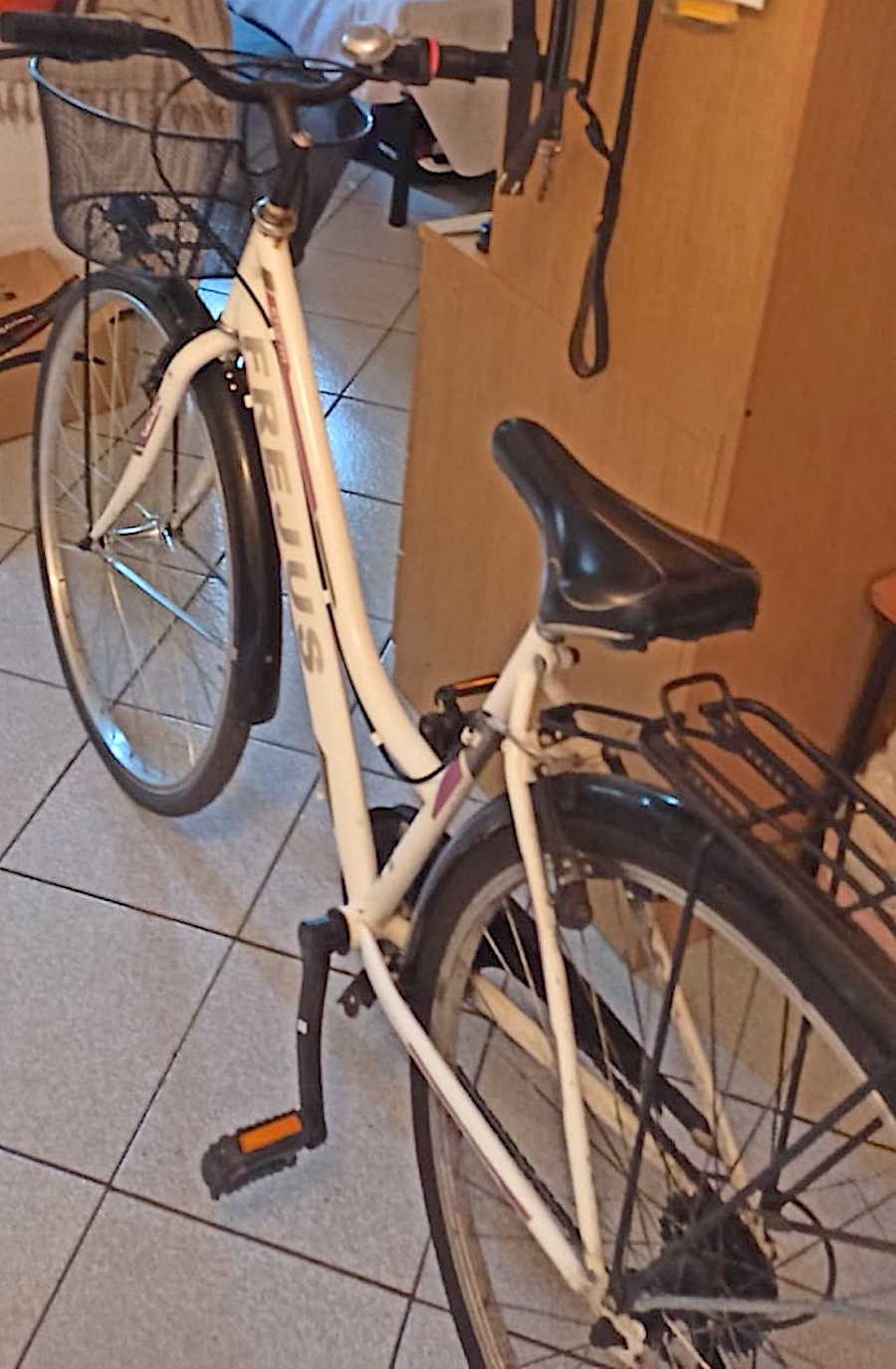 descrizione / segni particolari: Bici da città, telaio bianco con la scritta FREJUS in grigio e STORM in bianco, parafanghi e copricanna colore nero, commando marce con striscia rossa manubrio lato destro, cavalletto nero e argento allungabile, sellino un po' rovinato lato posteriore, campanello grigio su manubrio, due portapacchi neri, luce anteriore attaccata al cestino con una fascetta e con una manopola, luce rossa e portapacchi lato posteriore