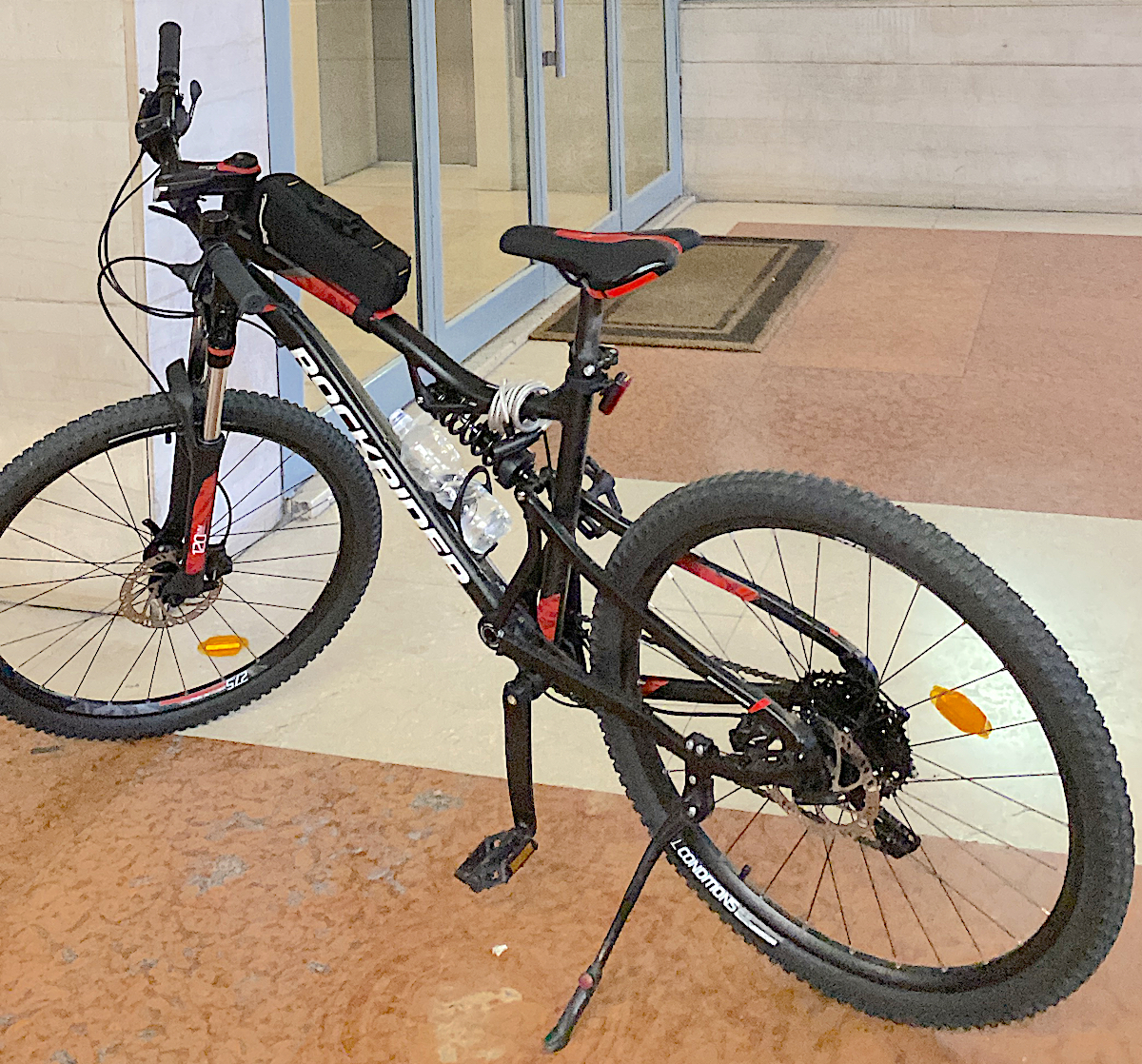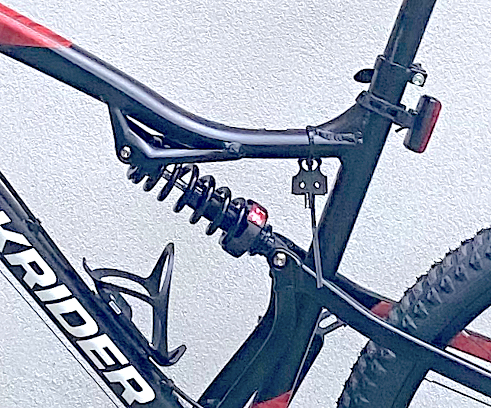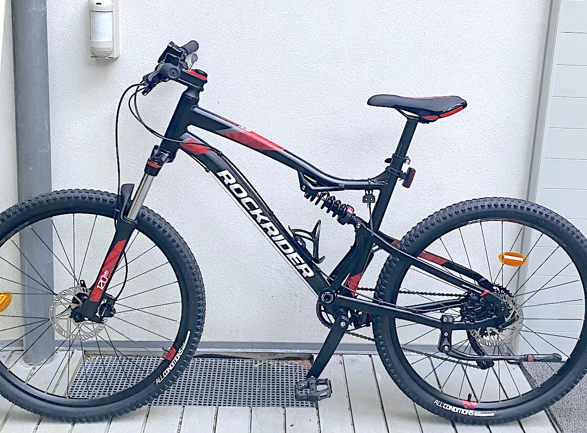 Mountain bike, telaio nero con accenti rossi e la scritta ROCKRIDER in bianco, doppio ammortizzata, freni a disco, grafiche rovinate sul lato destro della forcella