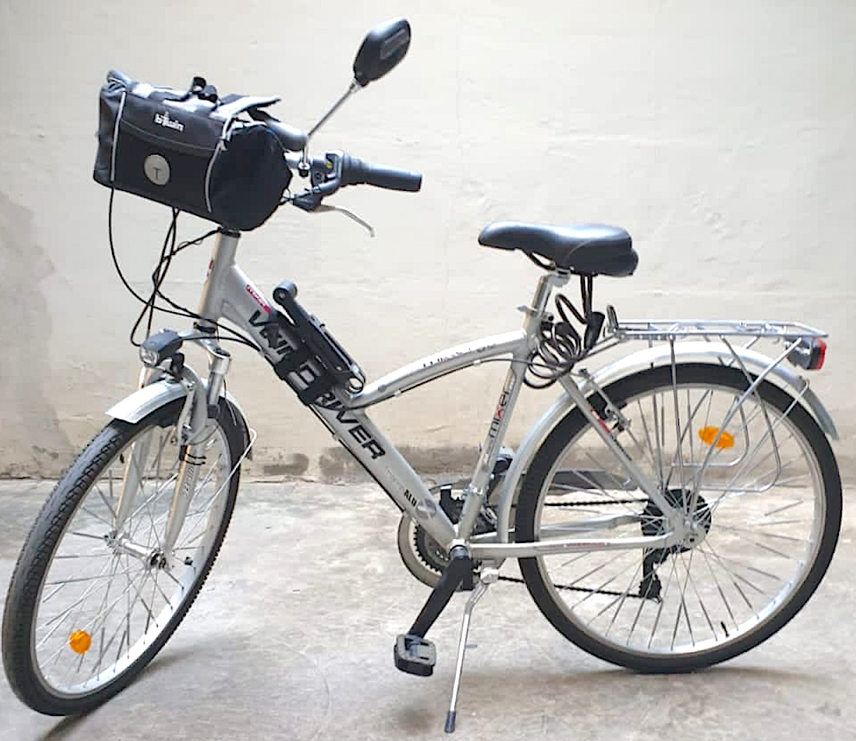 City bike, telaio argento con le scritte WINDRIVER e MIXER in nero, forcella ammortizzata, portapacchi posteriore argento, specchietto al manubrio, sui raggi tubetti rifrangenti