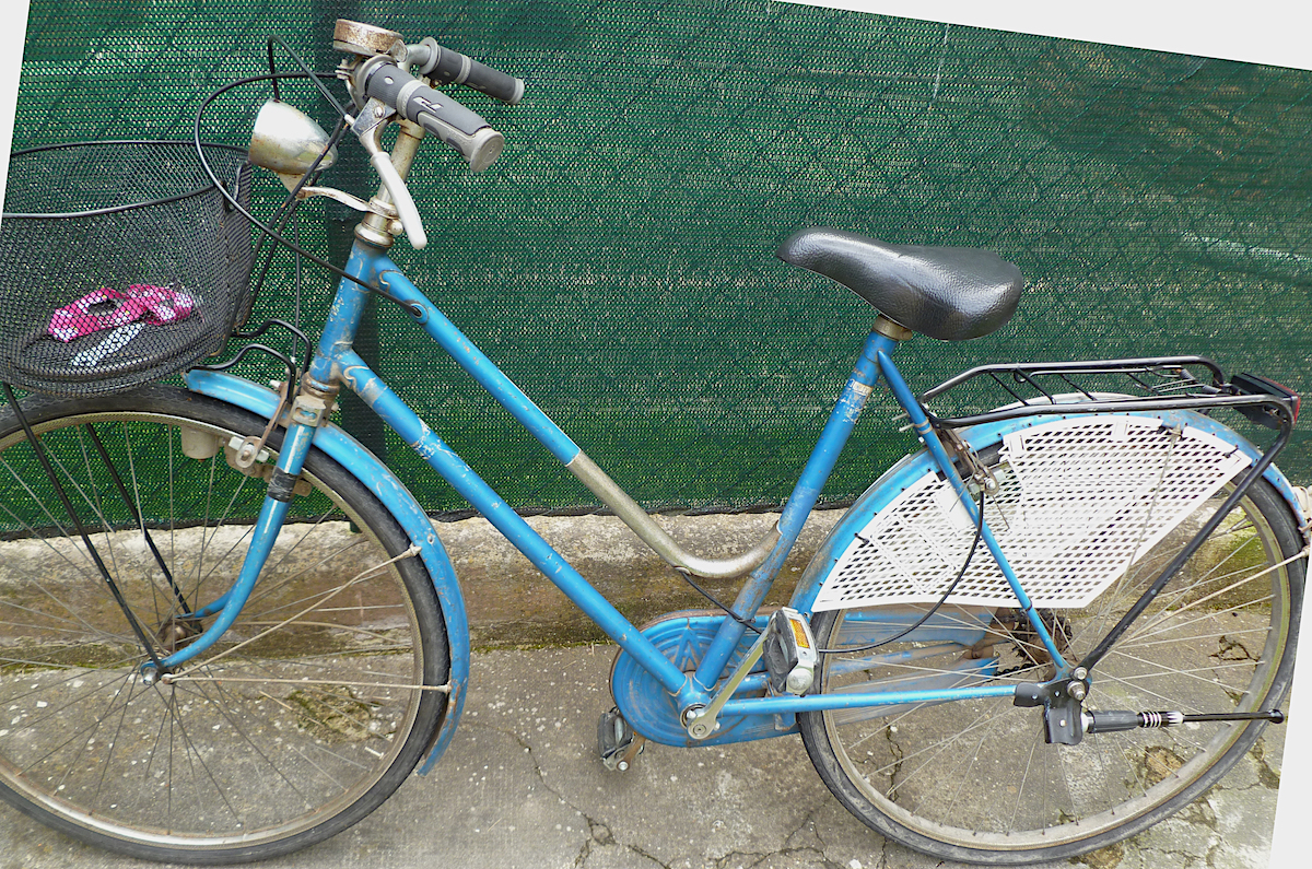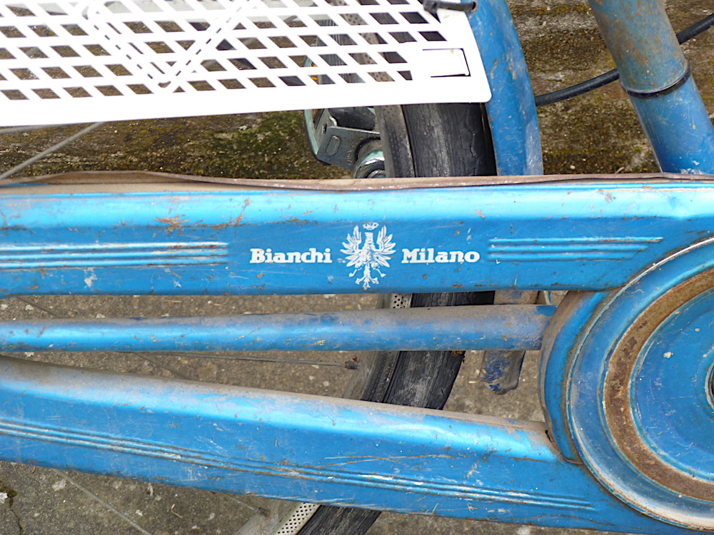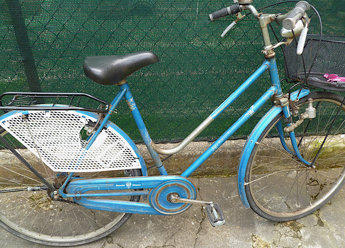 descrizione / segni particolari: City bike da donna, telaio blu con la scritta BIANCHI MILANO sul carter catena, tubo superiore metà cromato, cavo del freno che passa all'interno del tubo, due portapacchi neri, cestino nero davanti, rete paragonna in plastica bianca, aggiunto cavalletto nero alla ruota posteriore, fanale anteriore in metallo, dinamo alla ruota anteriore