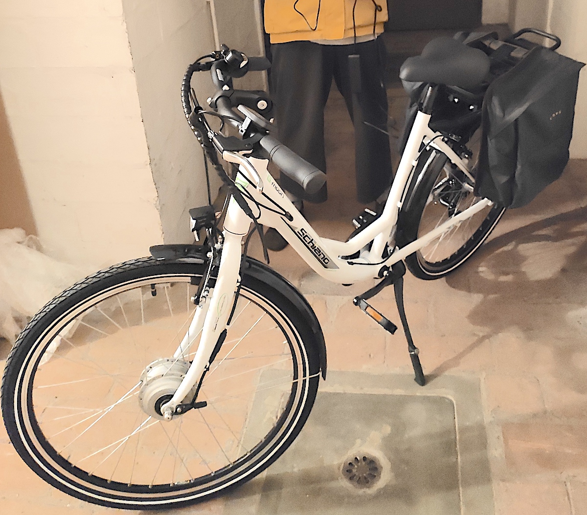 Bici elettrica, telaio bianco con la scritta SCHIANO in nero, borse posteriori, bianca, ruote da 26 pollici