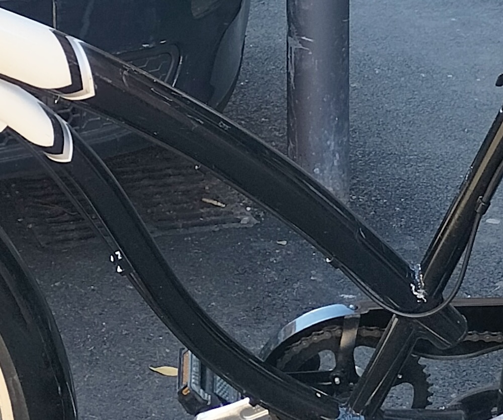 Bici cruiser con marce, telaio nero con forcella bianca, cestino anteriore, sellino con scritto Beach Beach, parafanghi neri, cavalletto