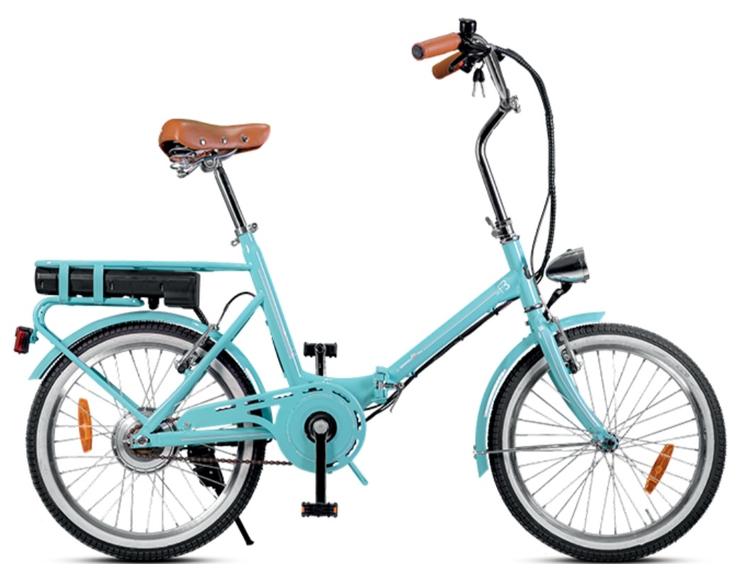 Bici pieghevole elettrica, telaio azzurro acceso, sella e manopole marroni, una manopola cade e ha qualche graffio