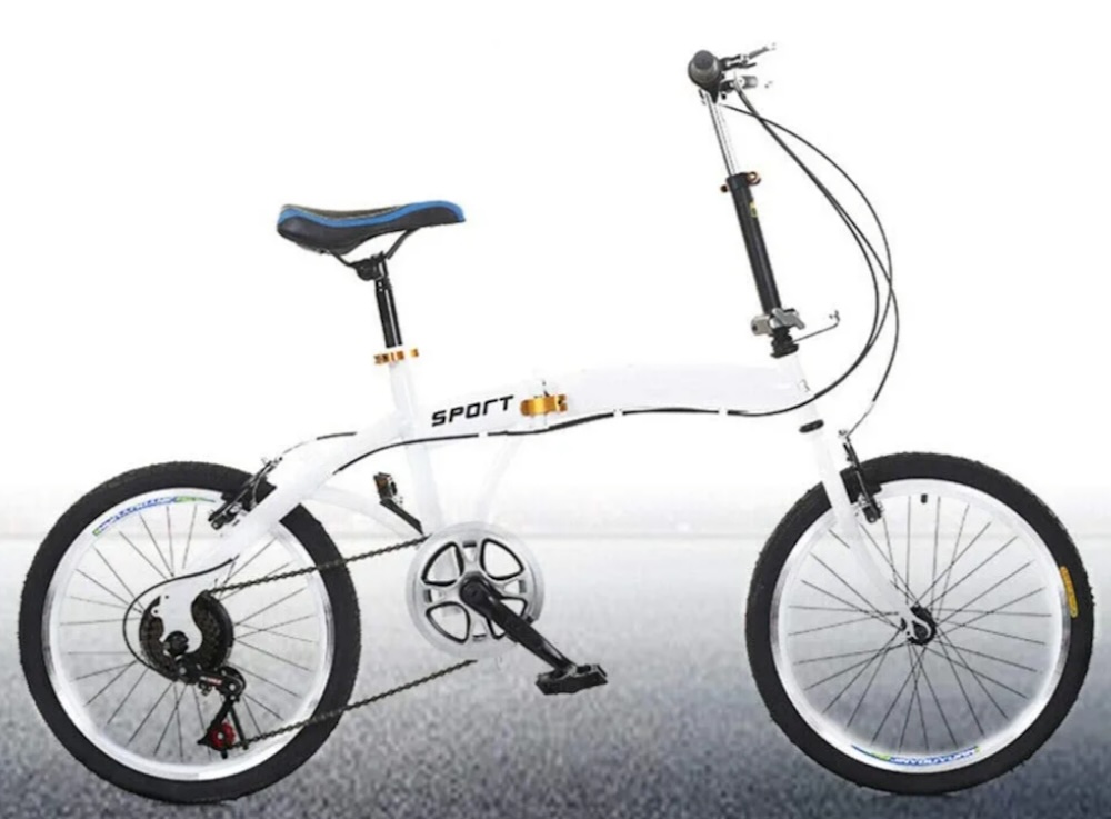 Bici pieghevole con le marce, telaio bianco con la scritta SPORT in nero, ruote da 20"