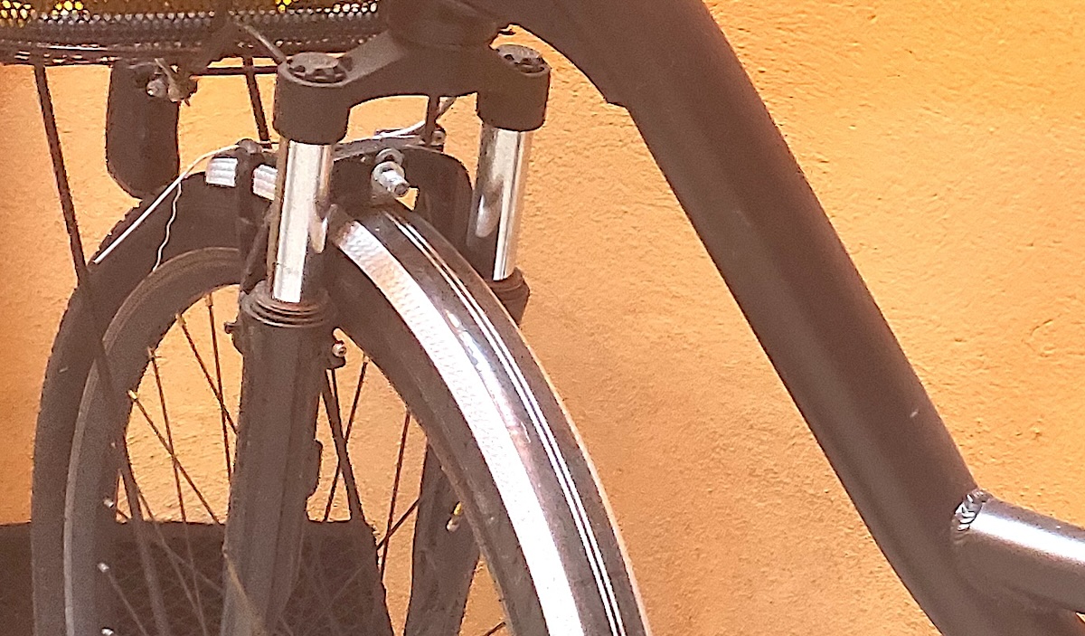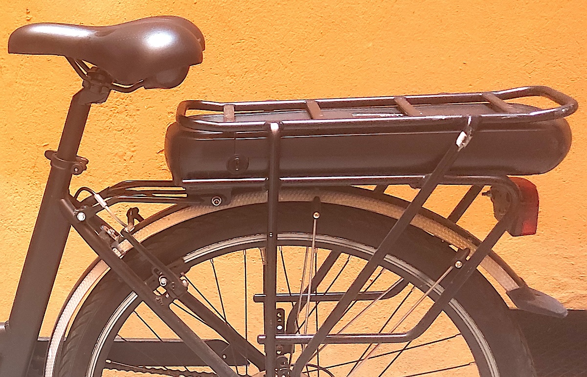 Bici elettrica, telaio nero (senza scritte di marca?), forcella nera ammortizzata, due portapacchi neri, specchietto sinistra, cestino anteriore, cavalletto