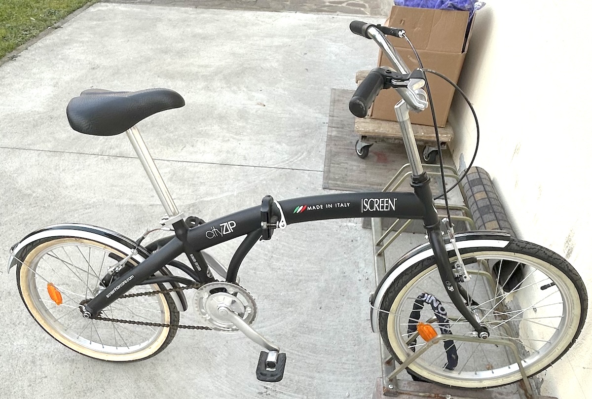 Bicicletta pieghevole CityZIP con adesivi SCREEN (marca di parrucchieri), parafanghi argento e neri, copertoni neri con striscia bianca, pedali pieghevoli