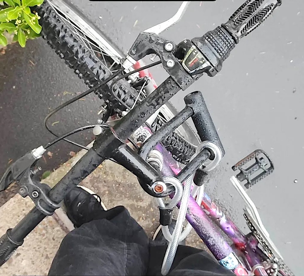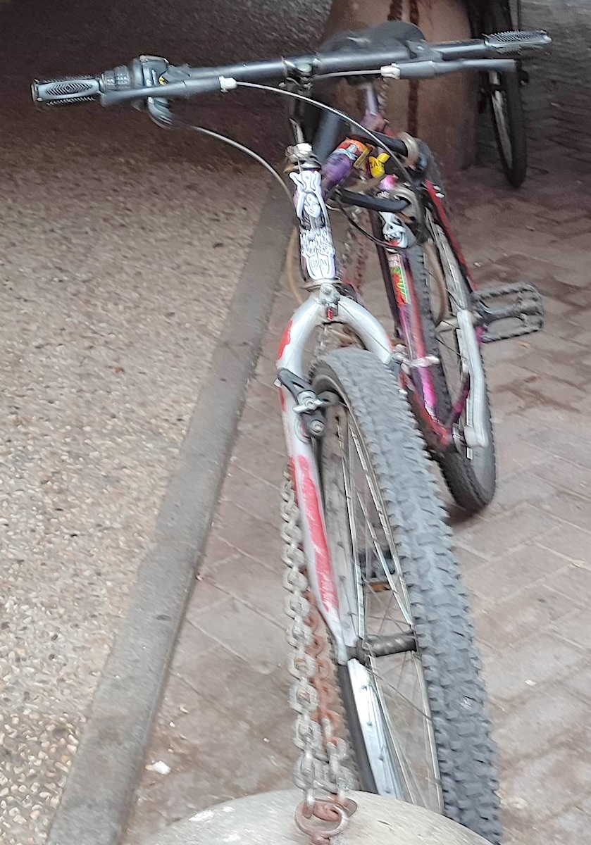 descrizione / segni particolari: Mountain bike, tele principalmente viola con altri colori e con tanti adesivi (non tutti facilmente staccabili), leve di freno di colori diversi SX nero in plastica spezzato e DX in metallo colore grigio, guarnitura di 3 rapporti ma senza cambio, pignoni di 6 marce