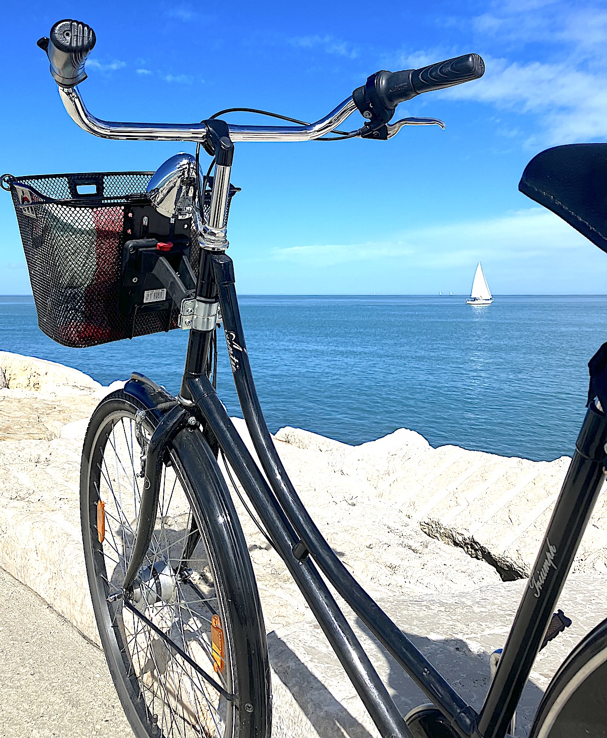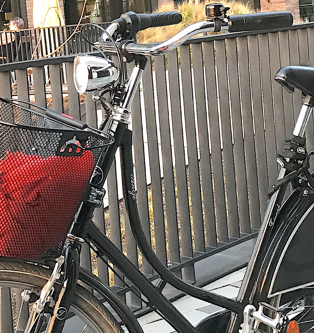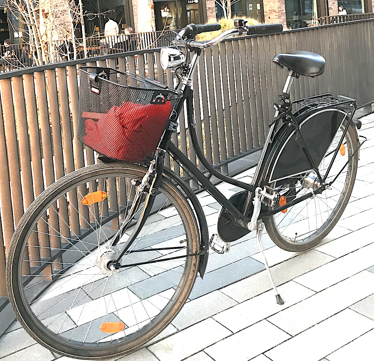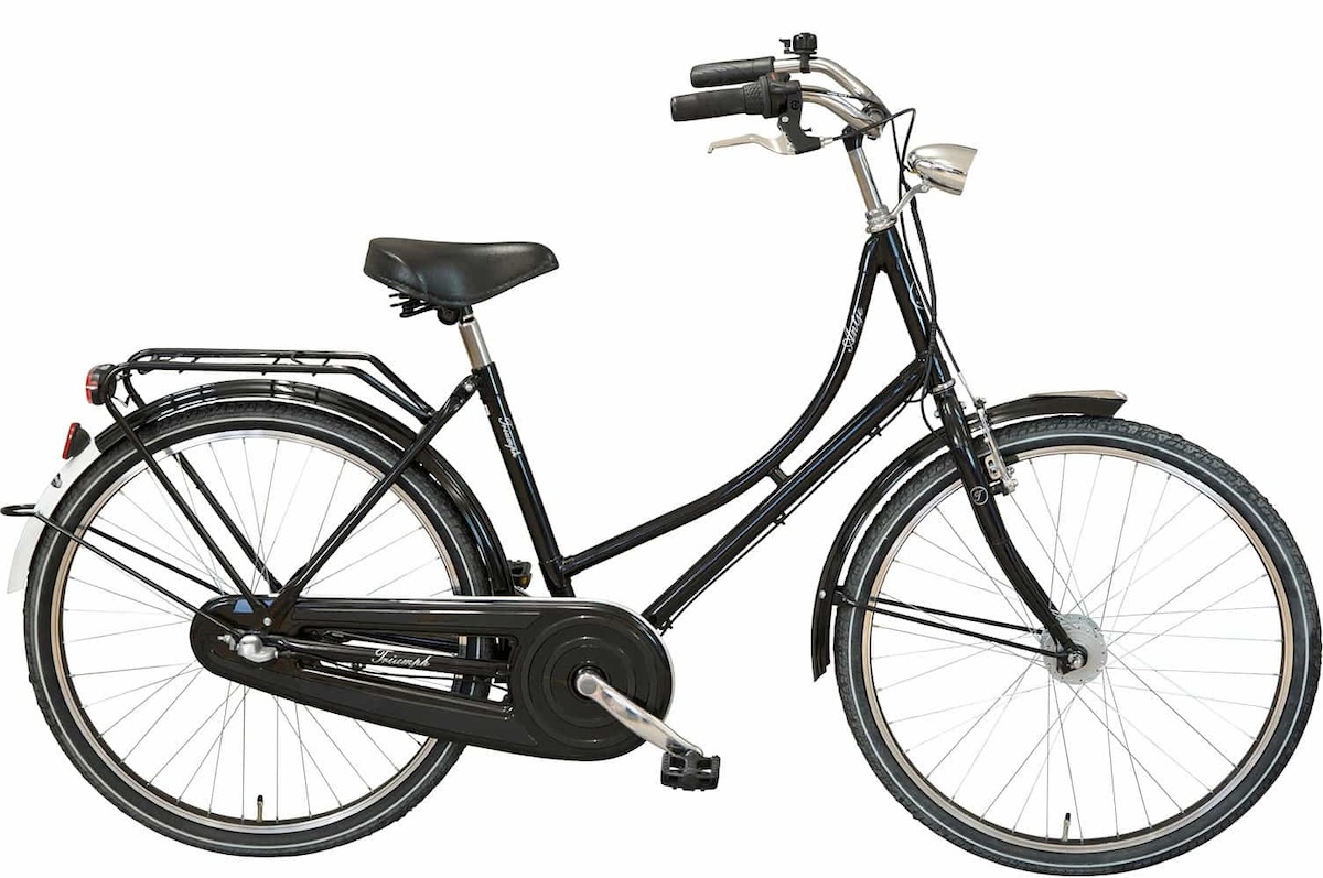 City bike da donna comprata in Germania nel 2012, telaio nero con le scritte ANTJE e TRIUMPH in bianco, parafanghi neri, cambio nel mozzo posteriore, dinamo nel mozzo anteriore, carter catena nera