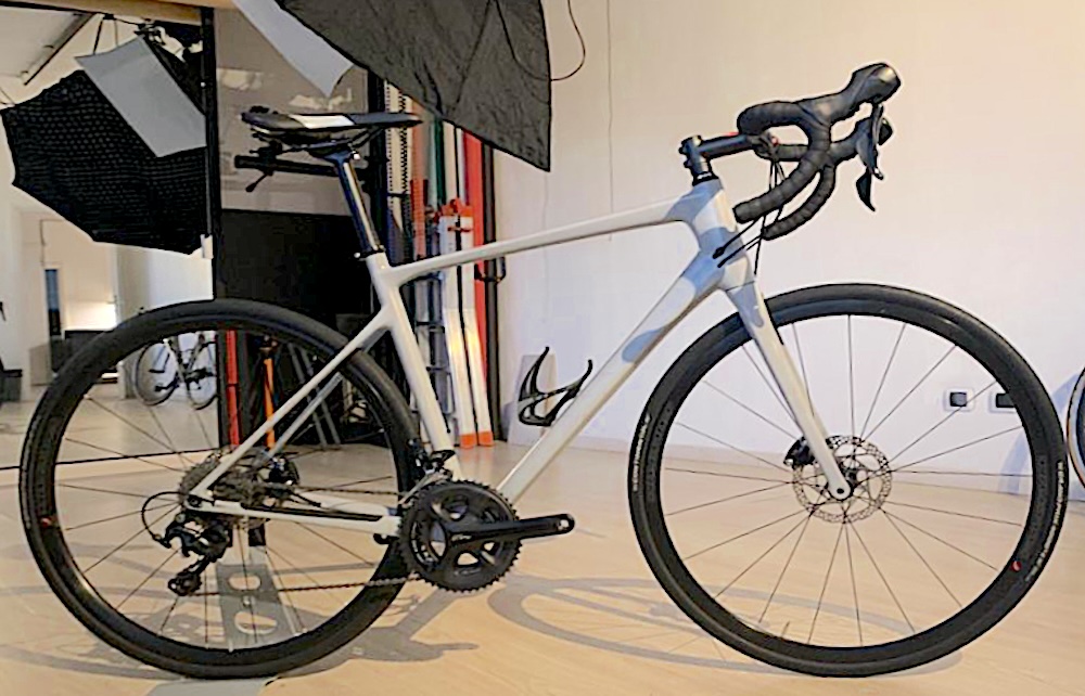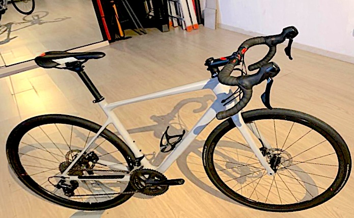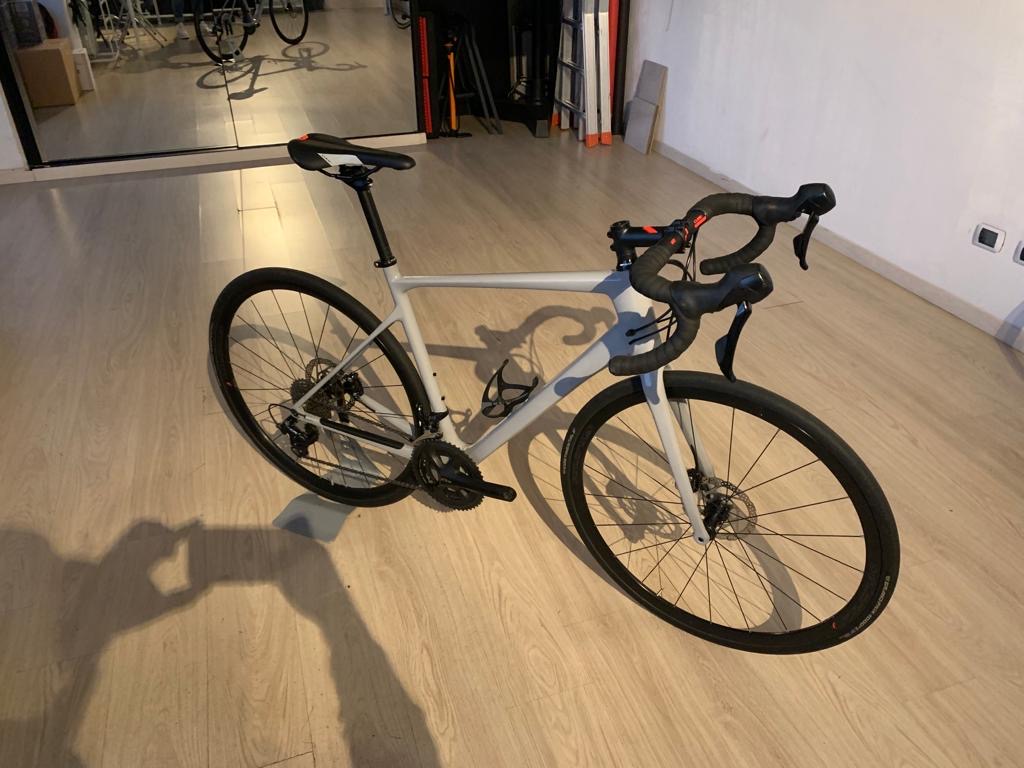 Bici da corsa, telaio grigio chiaro, freni a disco, sellino nero, bianco e arancione, attacco farmi anteriore, portaborraccia in plastica nera