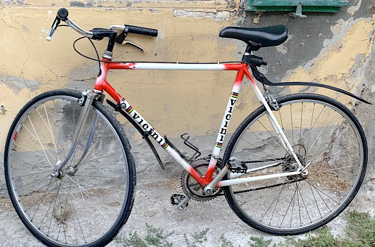 Bici da corsa trasformato in city bike, telaio bianco e rosso con la scritta VICINI in nero, forcella cromata, attacco manubrio nero, cerchioni marca Campagnolo, portaborraccia nera, parafanghi inni plastica nera
