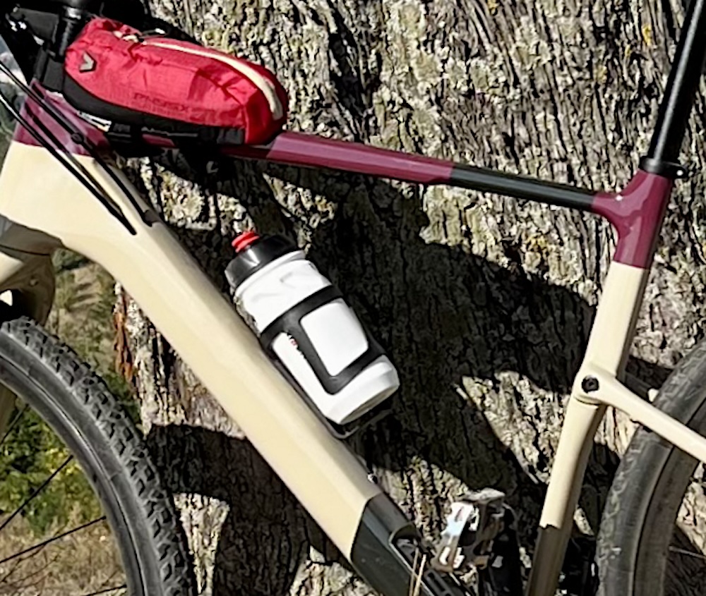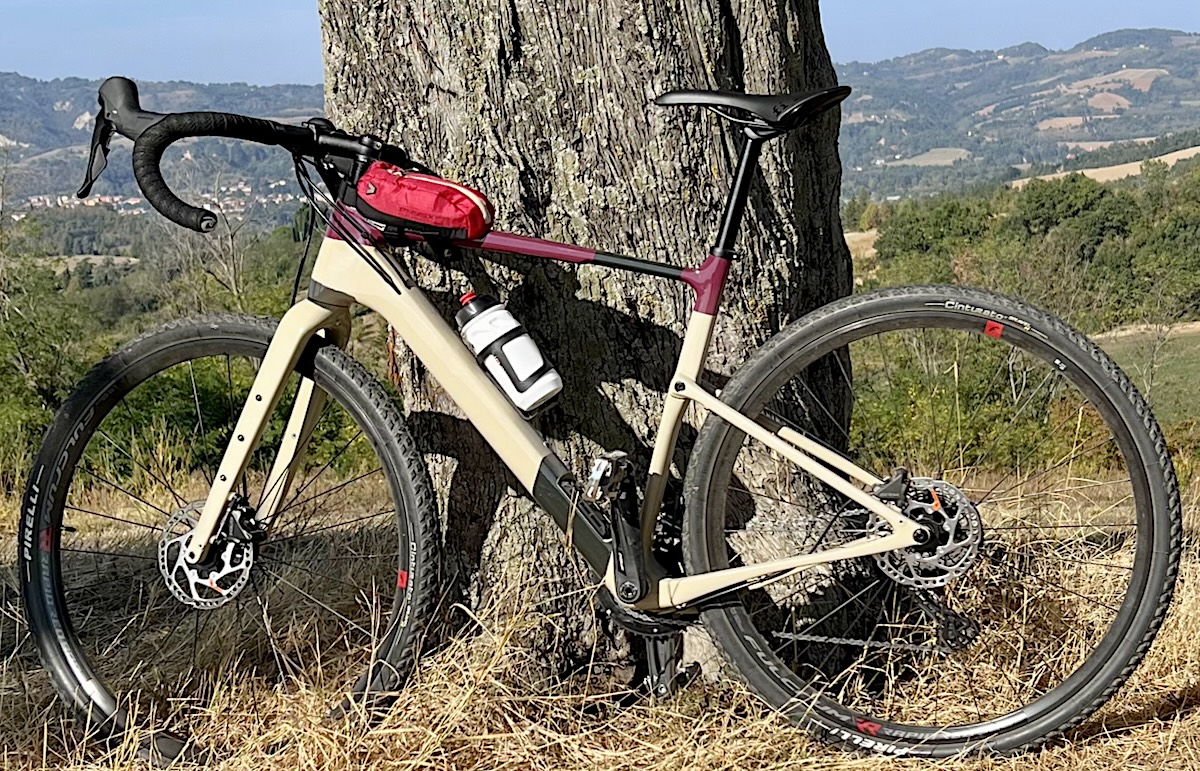Bici da corsa / gravel, telaio colore panna viola e nero senza scritte di marca, freni a disco, cerchi neri marca Fulcrum, copertoni Pirelli Cinturato, sellino nero marca Fizik