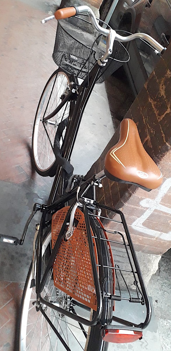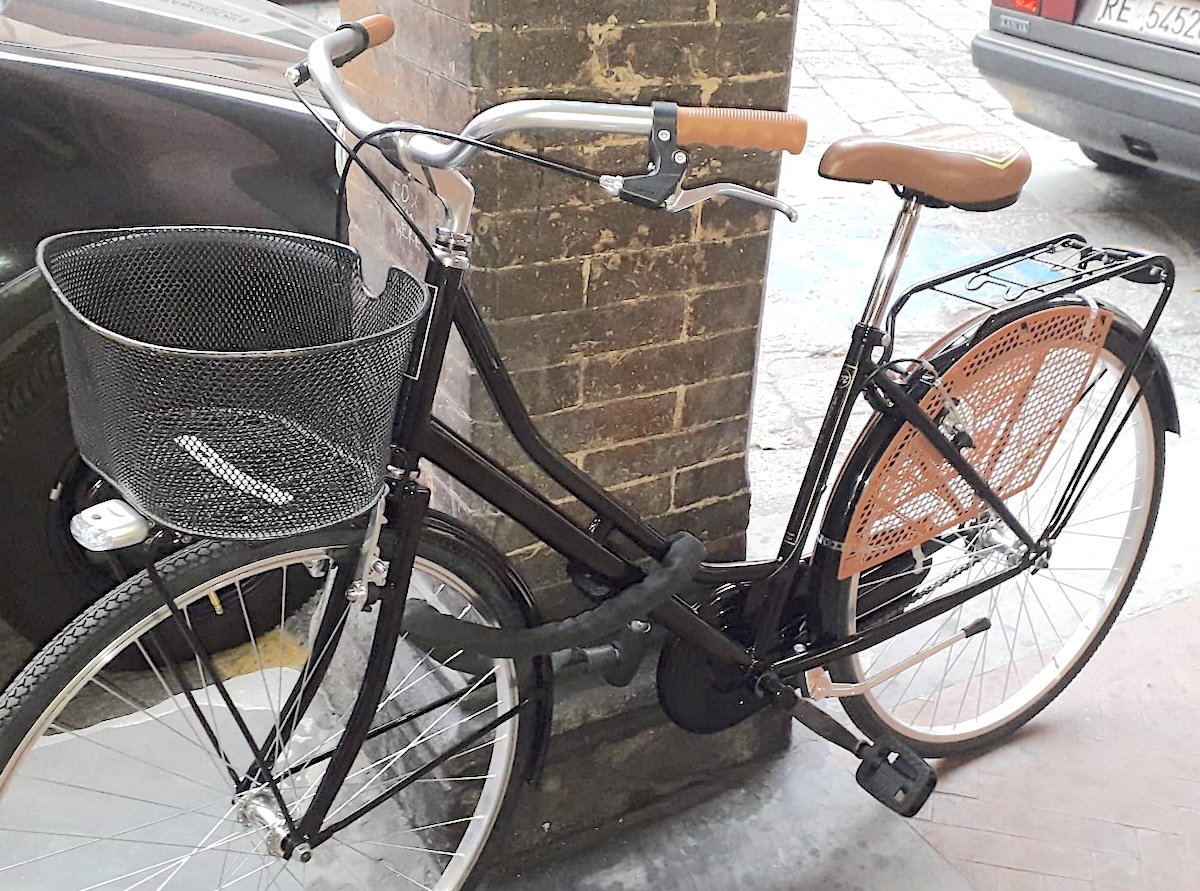 Bici tipo olandese stile vintage, telaio nero con la scritta ALPINA sul tubo sella, manopole, sellino e paraggi colore marrone chiaro, ruote da 26", monomarce