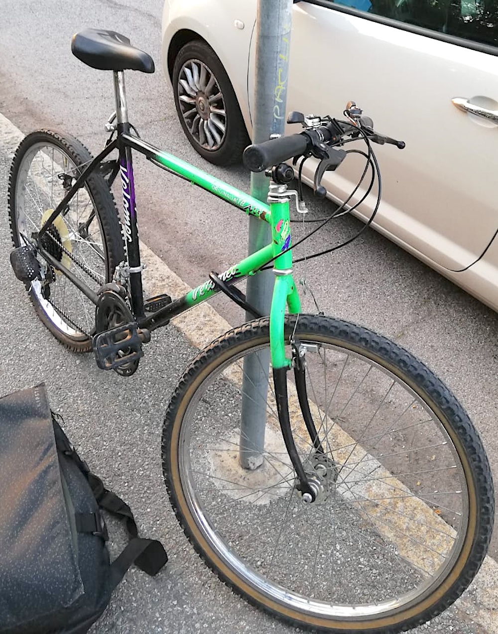 descrizione / segni particolari: Mountain bike, telaio verde davanti e nero dietro con la scritta VELOMEC in bianco, vernice un pò arrugginito rispetto alla foto, campanello piccolo nero rotto,