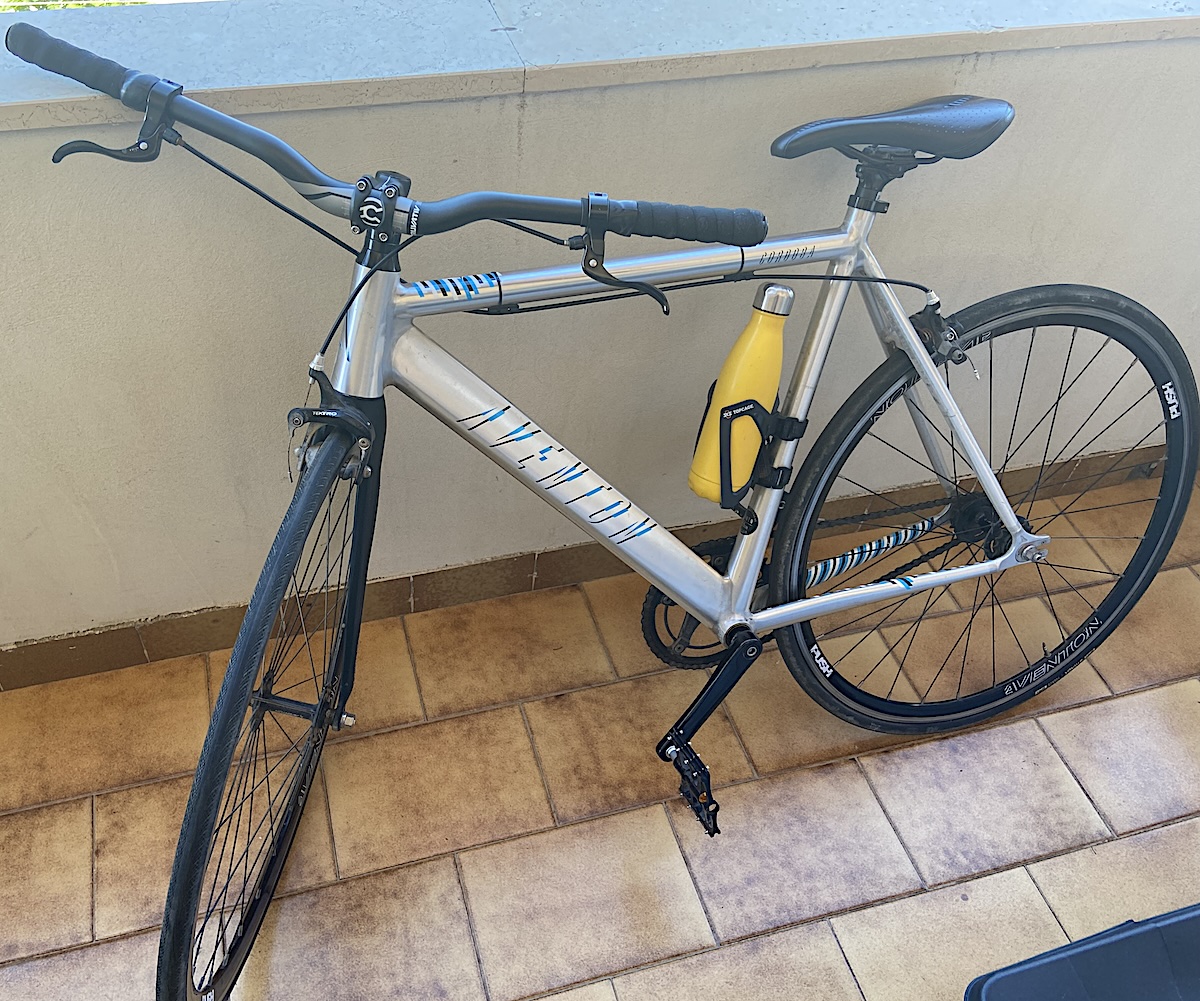 Bici single-speed, telaio argento con la scritta AVENTON in nero e blu, forcella nera dritta, manubrio Ergotech cruiser, pedali neri stile piattaforma, freni neri marca Tektro