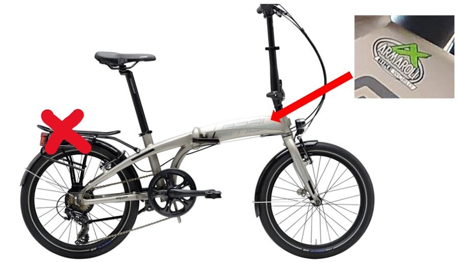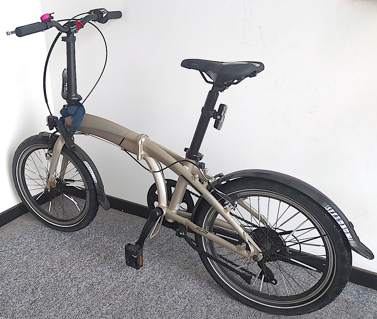 descrizione / segni particolari: bici pieghevole con le marce, telaio colore oro / argento con la scritta ADRIATICA in argento, catarinfrangenti grigi ai raggi delle ruote; campanello rosa; adesivo Armaroli appena sotto al gancio per chiudere il manubrio